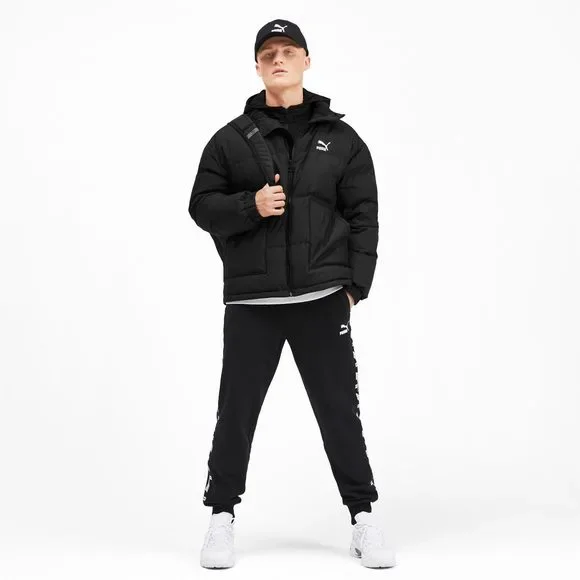 Style: 595281-01Color: Puma BlackGender: Mens* Regularfit* Full zip closure with PUMA branded zipper* Padded with down feathers* Stand-up collar with sherpa lining* Packaway hood for optional protection* Dual kangaroo style patch pockets* Elastic cuffs for comfortable fit* Adjustable waitband with inner bungee draw cord* PUMA Archive No.1 Logo on upper left chest* 100% polyester