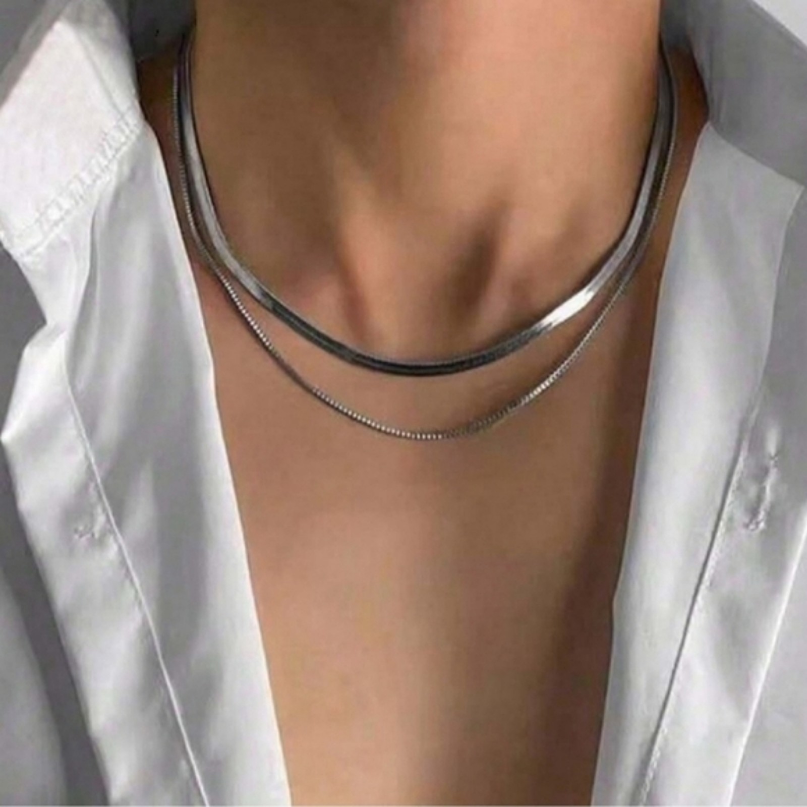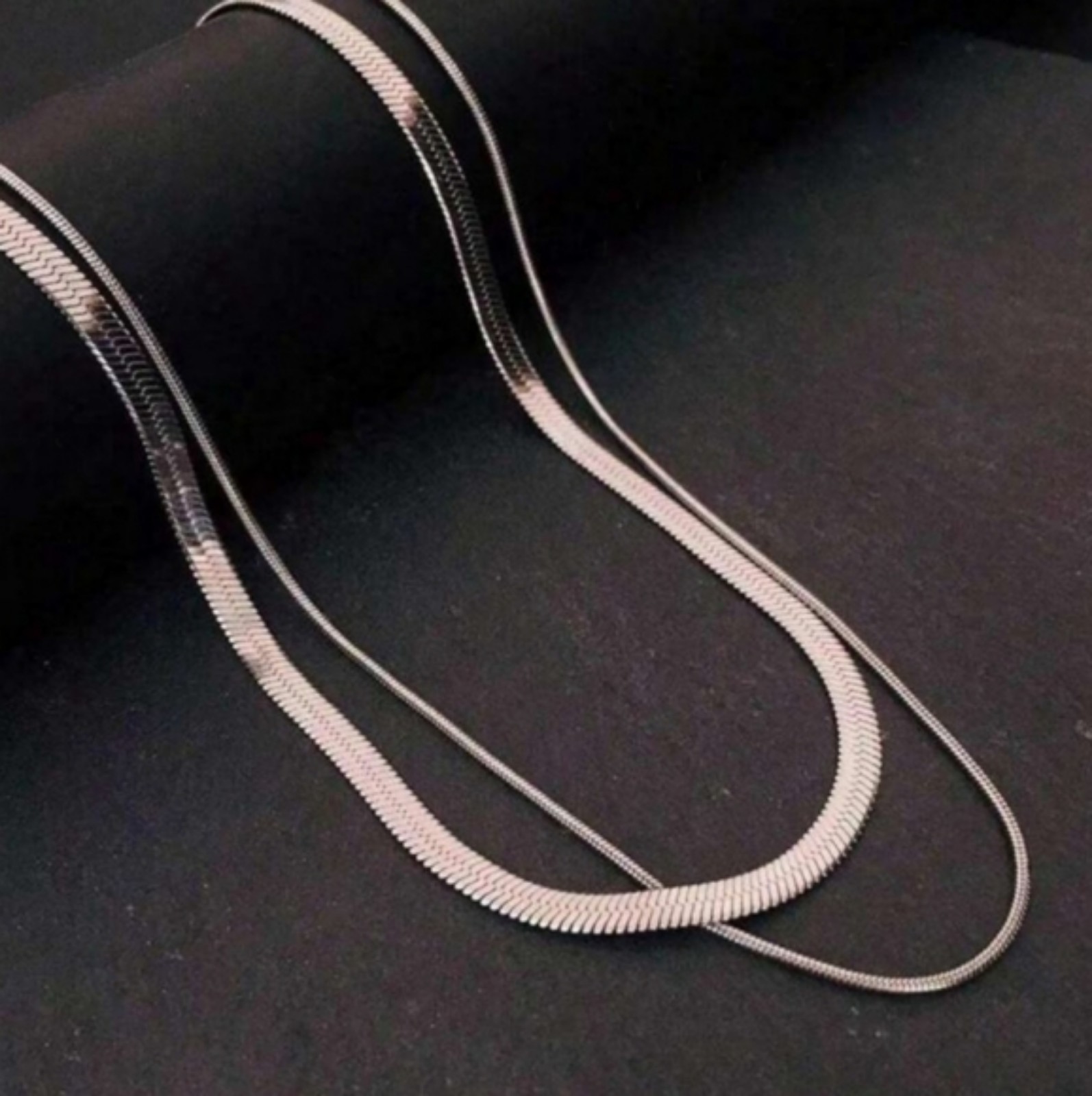The Anthropologie Minimalist Double Layered Herringbone Snake Chain Necklace has a silver herringbone layer and a silver snake chain layer that closes with a clasp closure. Length is 16" + extender so it is adjustable.