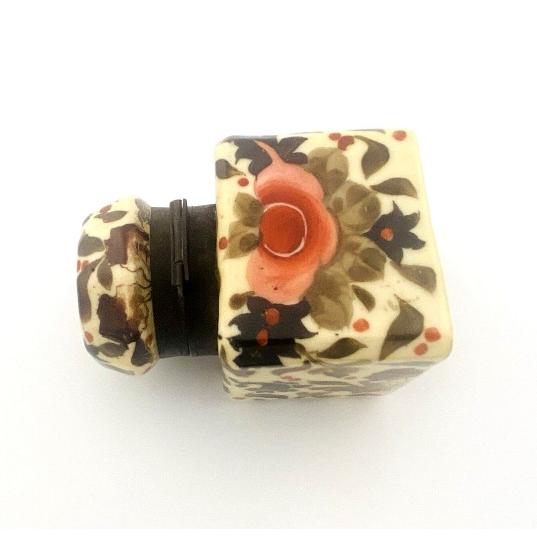 A lovely hand painted inkwell dating from the Victorian Era. It has a bold floral pattern with gold accents. It is hand painted and not a transfer. It is heavy, likely porcelain, in a warm shade of beige. The flowers are pink.
