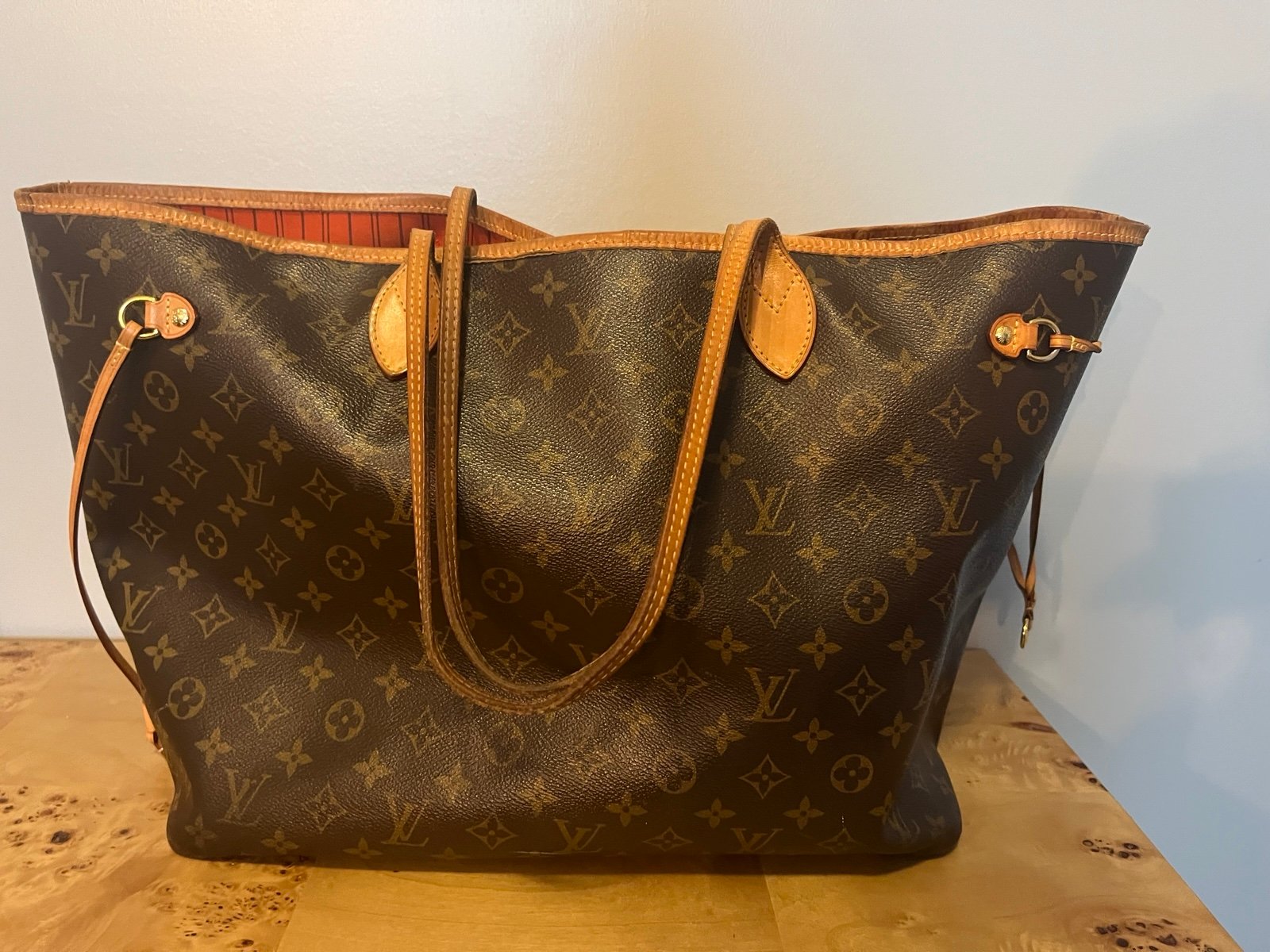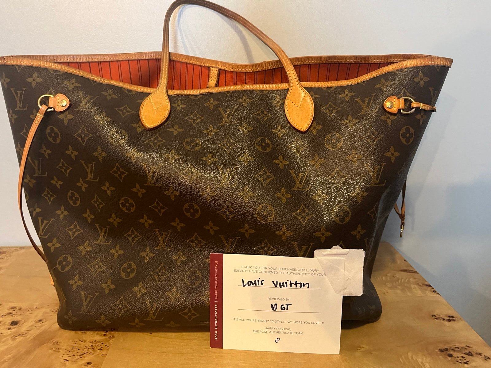 Purchased a few years ago from Poshmark. Authenticated (see photo). Some cracks in piping but none in leather. All hardware is functional. Initials stamped on one side. Comes with purse organizer (like new) and dust bag (see photos). Some stains on the inside bottom of bag.