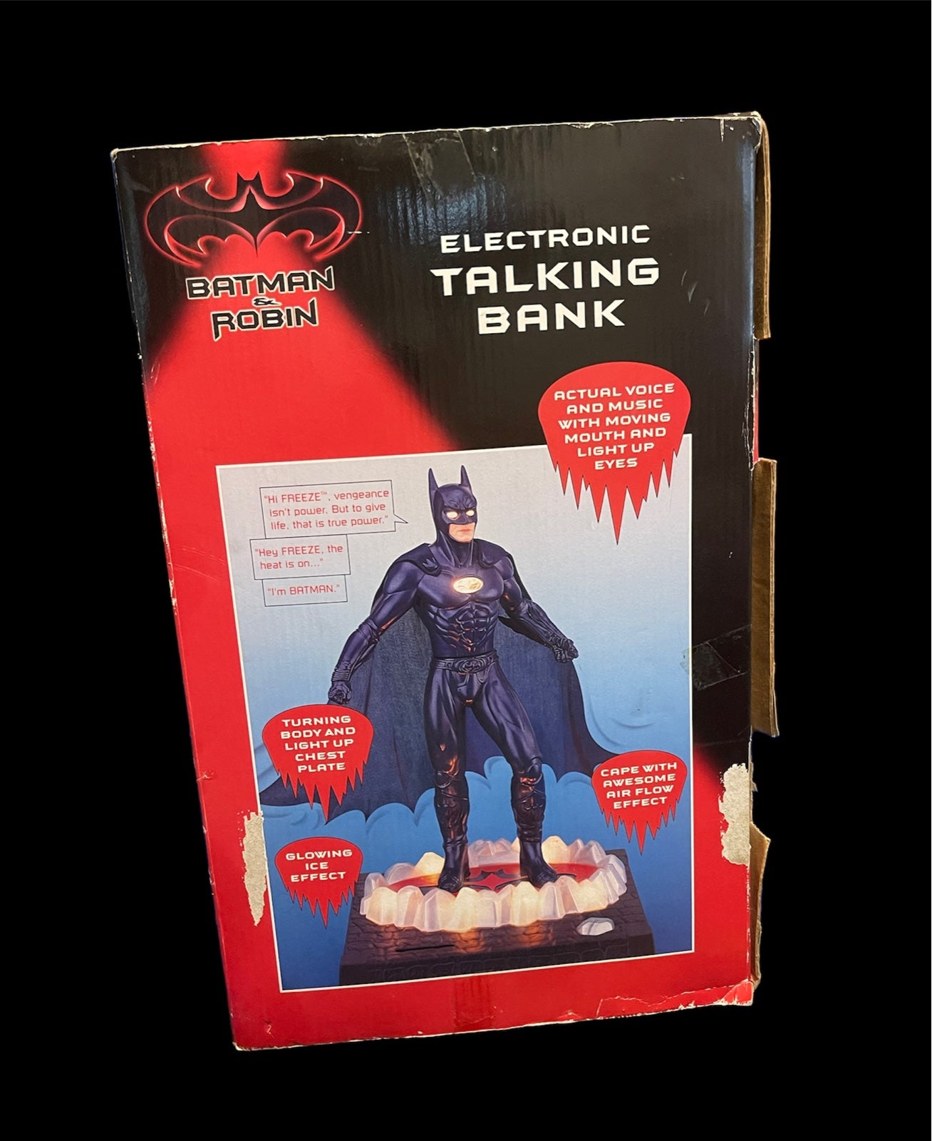 Batman & Robin Batman Electronic Talking Bank 1997 Think Way actual voice and music moving mouth and fabric cape with air flow effect turning body with light up chest plate and glowing ice insert coin or press ice cube for effects.