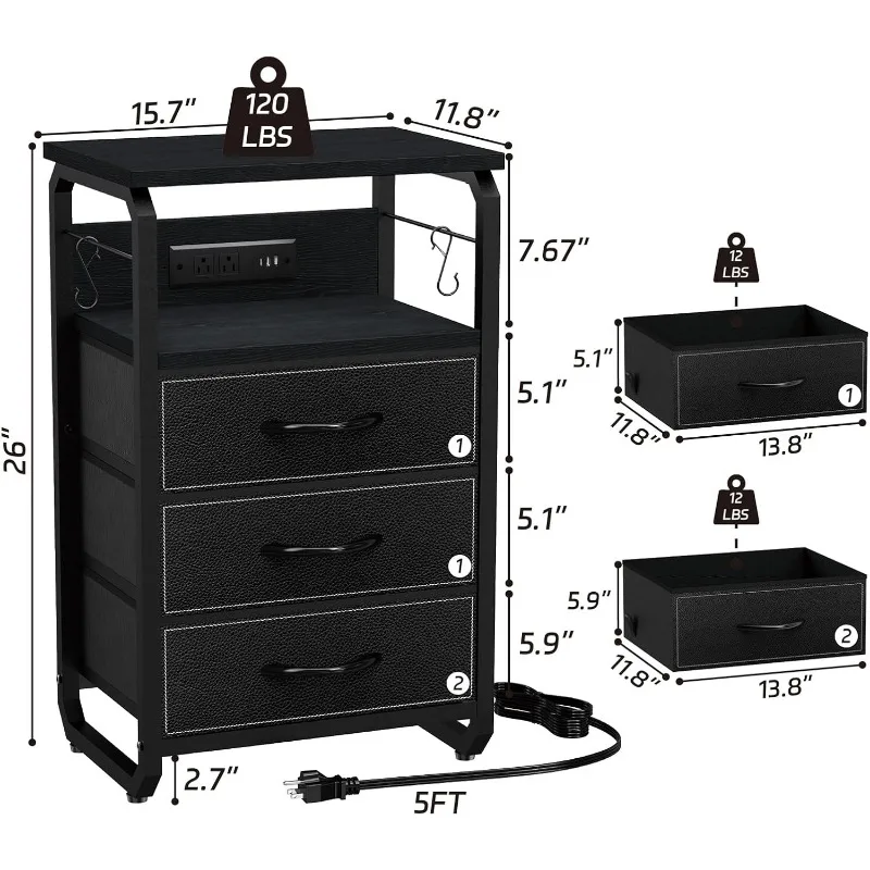 [Spacious Fabric Drawers and Hooks]: Our tall bedside table offers 3 large fabric drawers, providing ample storage space for personal items such as coffee, jewelry, clothes or gifts, bearing up to 12 LBS. Additionally, the end table is equipped with 2 practical metal hooks for hanging items, ensuring a neat and organized bedside space