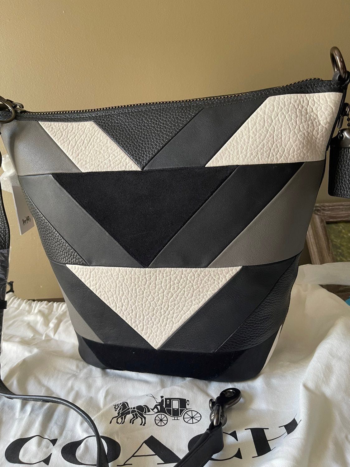 An iconic Coach silhouette first introduced in 1971, the Duffle is crafted in a colorblock mix of leathers and suede in an edgy chevron patchwork. It's updated with chunky hardware and a fringe zipper pull. ; Natural pebble leather, smooth leather, buffalo-embossed leather and suede Inside zip and snap pockets Zip-top closure, fabric lining Detachable strap with 13 1/2" drop for shoulder or crossbody wear Instantly change the look of your bag with an interchangeable strap. 10 3/4" (L) x 12" (H) x 6 1/2" (W)