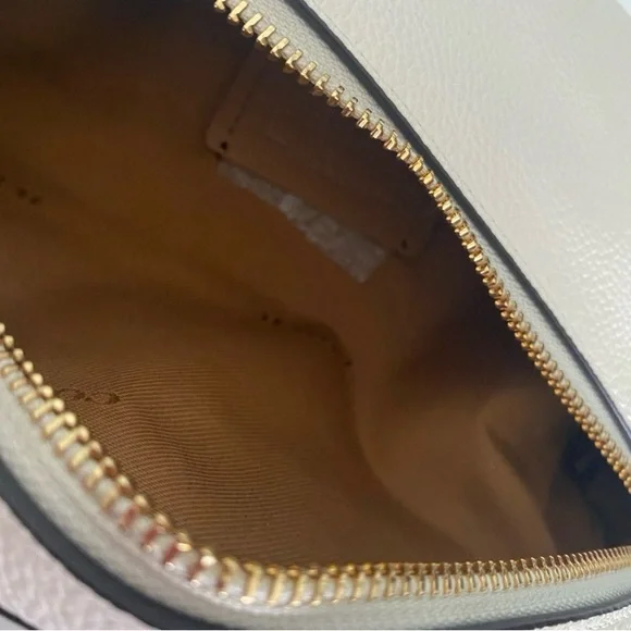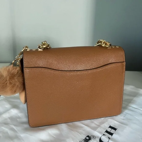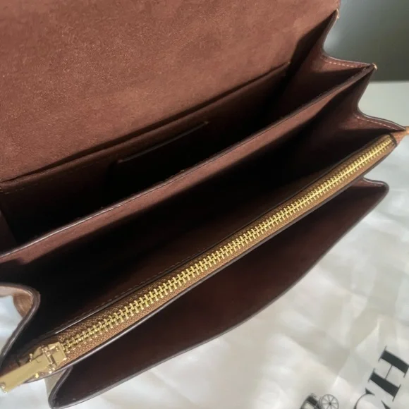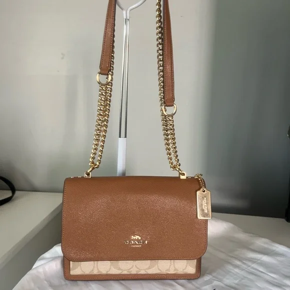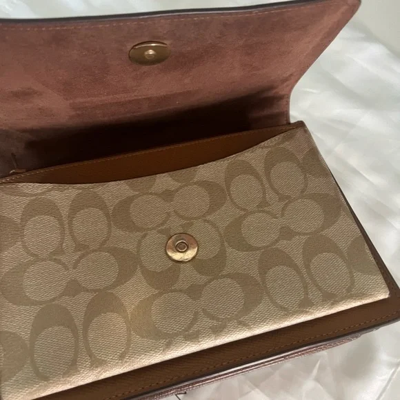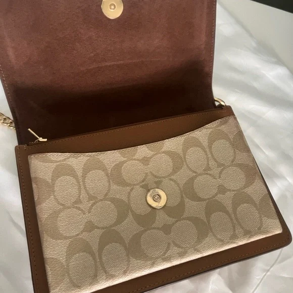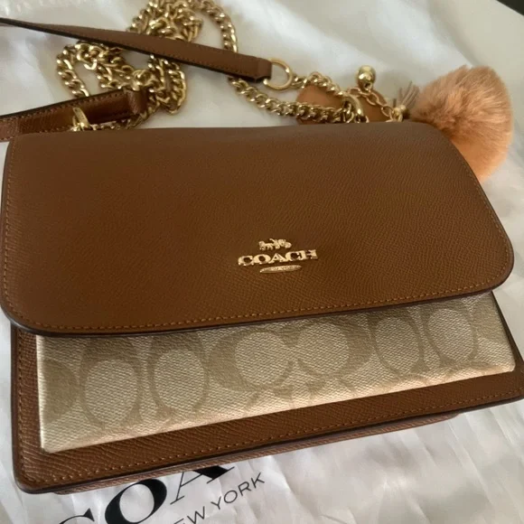 Chic Coach crossbody bag with gold chain accents. Features a tan and brown color scheme. Ideal for versatile styling.Authentic Product DetailsSignature coated canvas and smooth leatherInside zip and multifunction pocketsSnap closure, fabric liningOutside slip pocketStrap with 22" drop doubles up for three ways to wear: short or long on the shoulder or crossbody style8 1/2" (L) x 6 1/4" (H) x 2 3/4" (W)In excellent condition Dust bag not included
