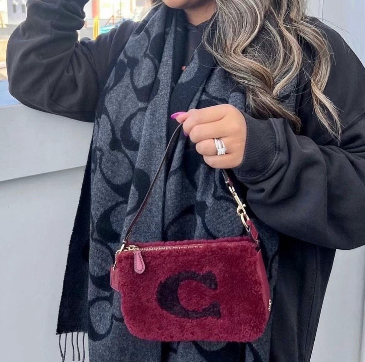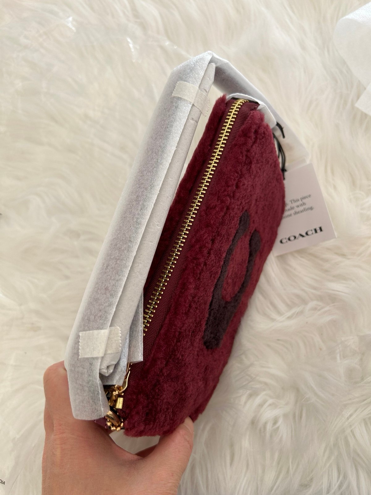 Brand new with tags a Coach Nolita 19 In Shearling With Coach Motif In Gold/Black Cherry