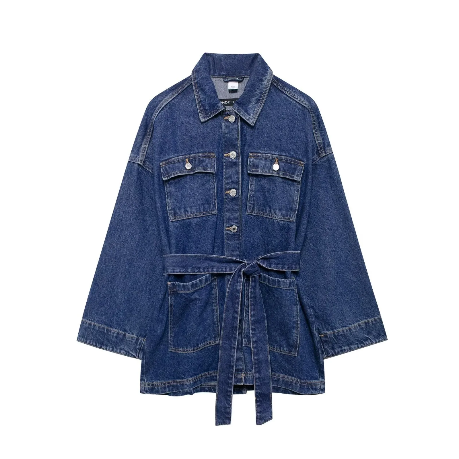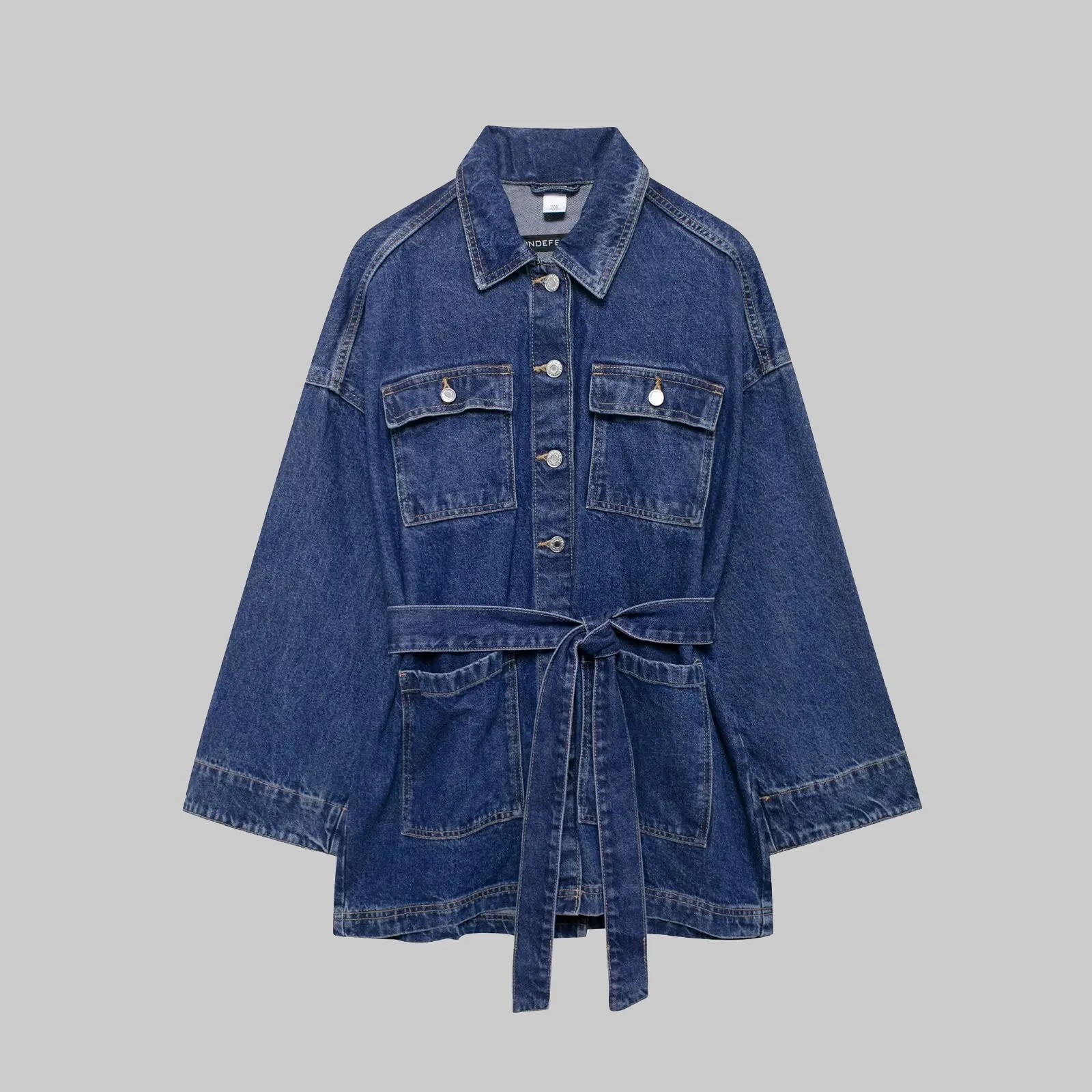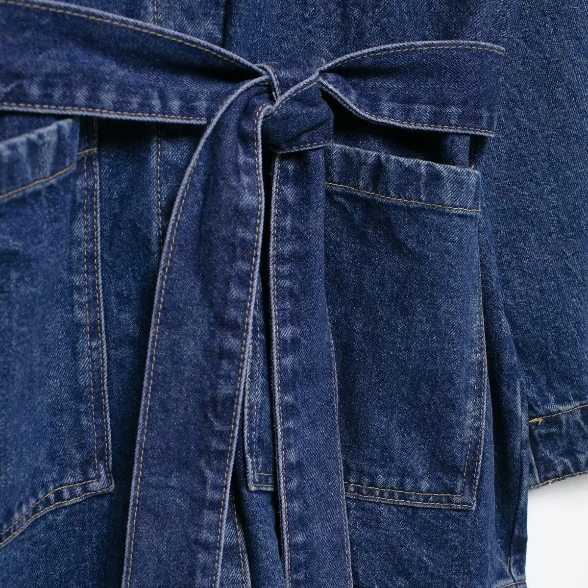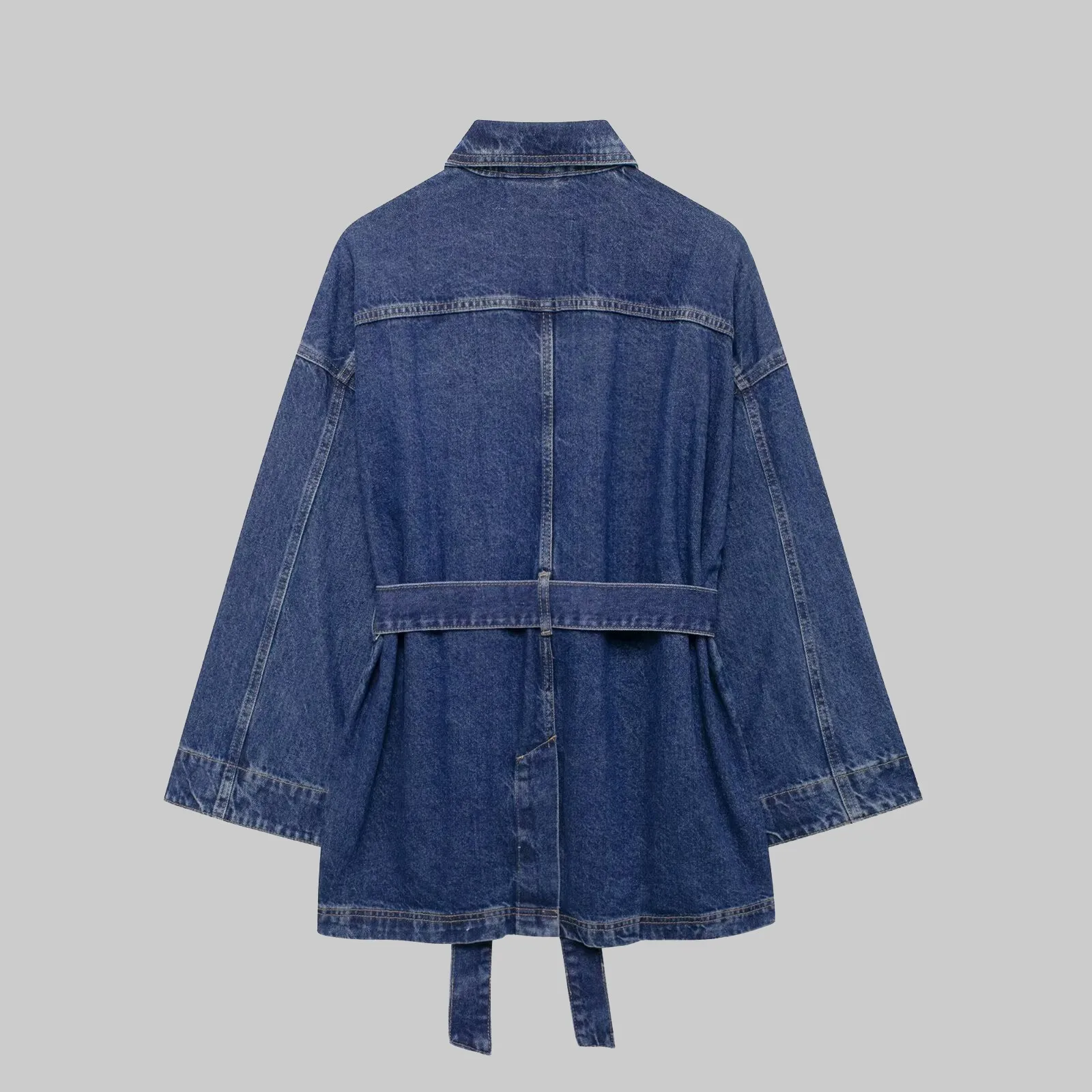 Raglan Sleeve, Chest Patch Pockets, Slant Pockets, Button Up, Turn Down , Tie Belt Waist, Denim Jacket
