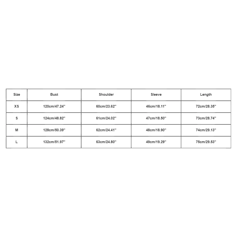 | Size:XS | Bust:120cm/47.24'' | Shoulder:60cm/23.62'' | Sleeve:46cm/18.11'' | Length:72cm/28.35'' |
