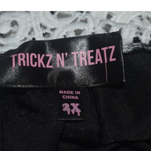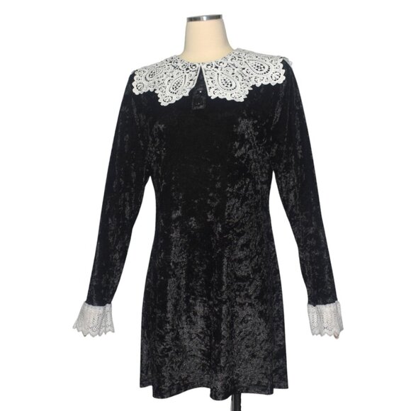 Great dress from Dolls Kill Trickz n' Treatz! Black crushed stretch velvet with white lace collar and cuffs. One button at center back neck. Size 2X. Bust stretches approx. 45-50 inches, waist approx. 37-44, length approx. 34.5 inches. Small discolor at back of collar, not really noticeable. Otherwise excellent.