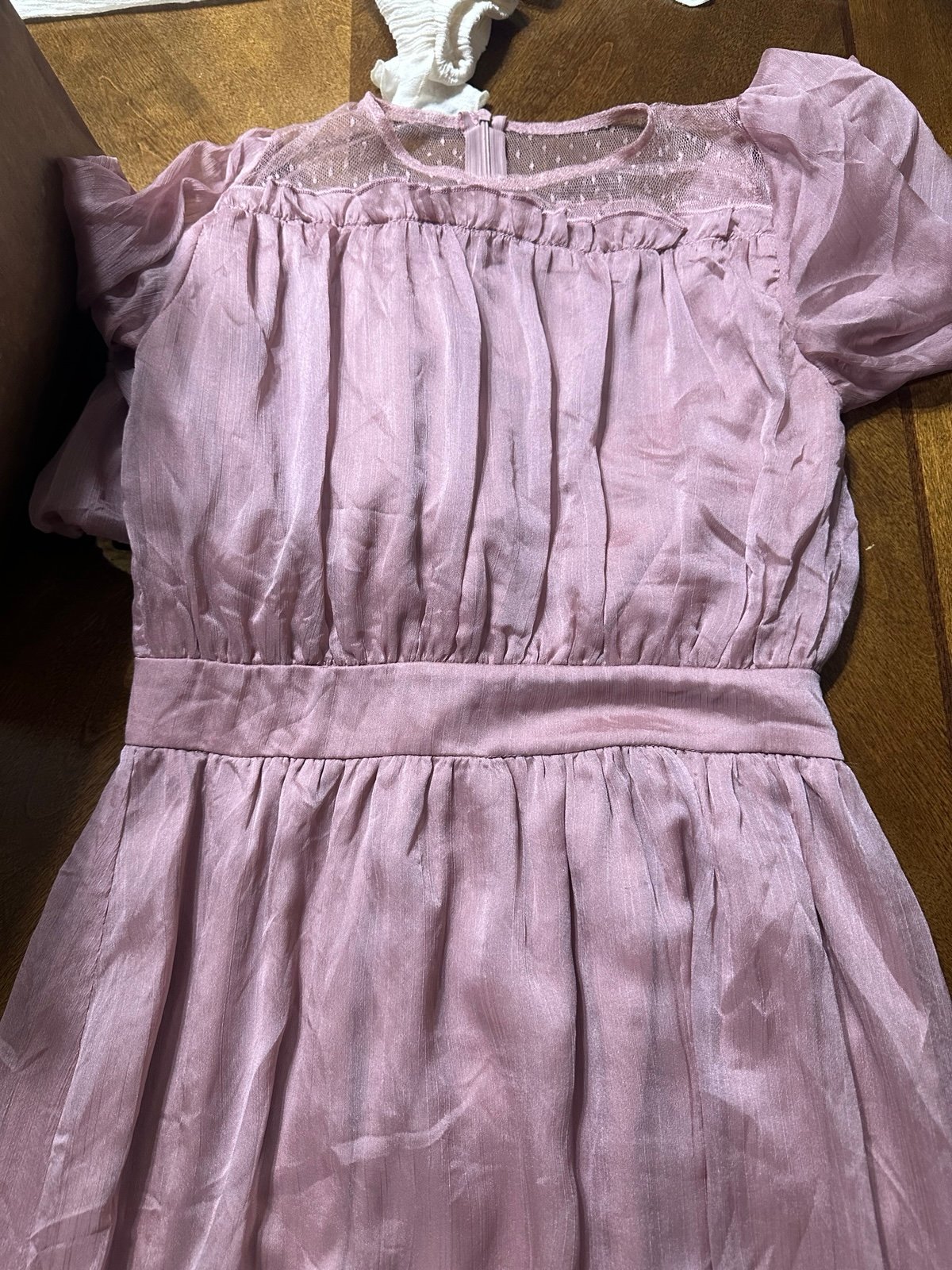 This is an elegant long dress by Joyfolie. It is in Like-New condition. It has no tags, and has been worn only once. It has a large ruffle on the bottom and is lined at the skirt area. At the waist is a band. The bodice and sleeves are beautifully laced, and with a hidden zipper at the back. The skirt area is softly lined at least pass the knees. It is lavender in color but a darker lavender. It is Girl’s size 12