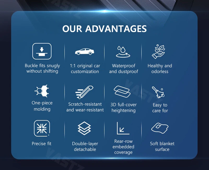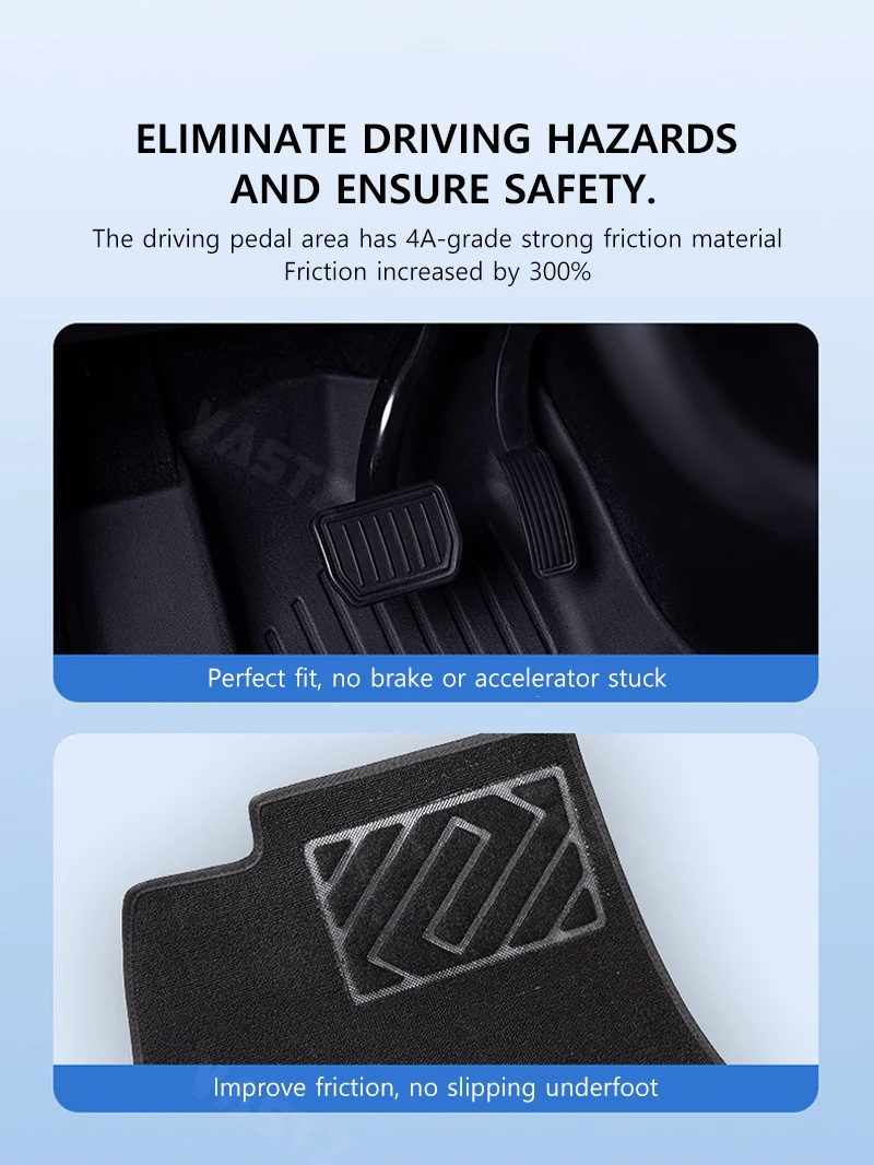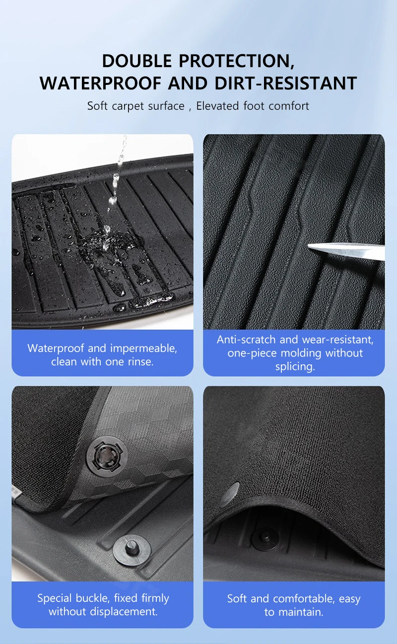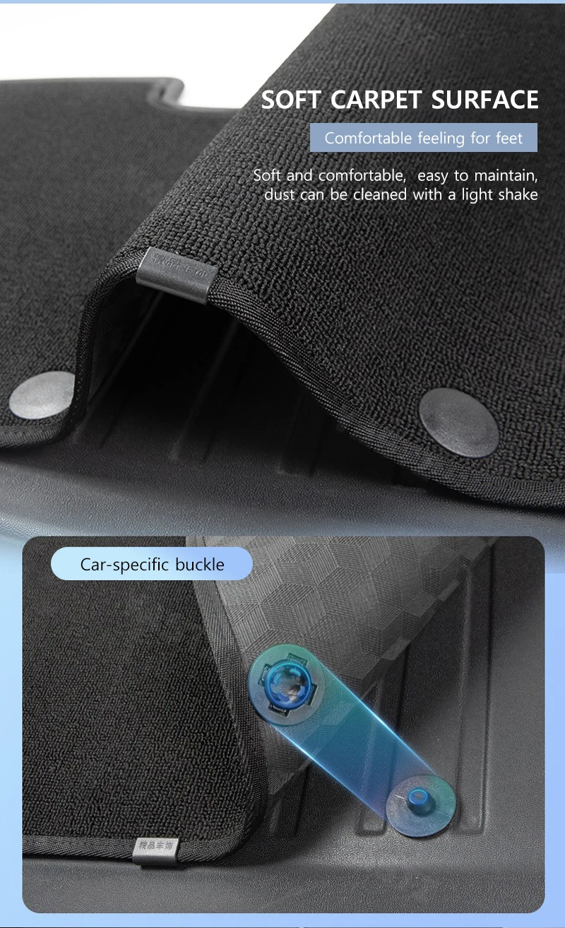 These mats offer comprehensive waterproof and dirt - resistant protection. The soft carpet surface enhances foot comfort, while the material is anti - scratch, wear - resistant, and easy to clean. Special buckles ensure firm fixation without displacement, eliminating driving hazards and ensuring safety.
