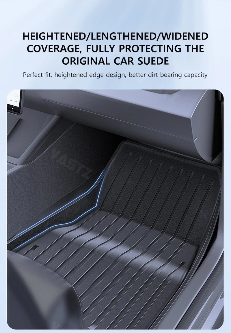 The mats feature a heightened/lengthened/widened design, offering extended coverage. This special lengthening ensures better protection for the original car suede, with a heightened edge design that increases dirt - bearing capacity, keeping your car’s interior cleaner.
