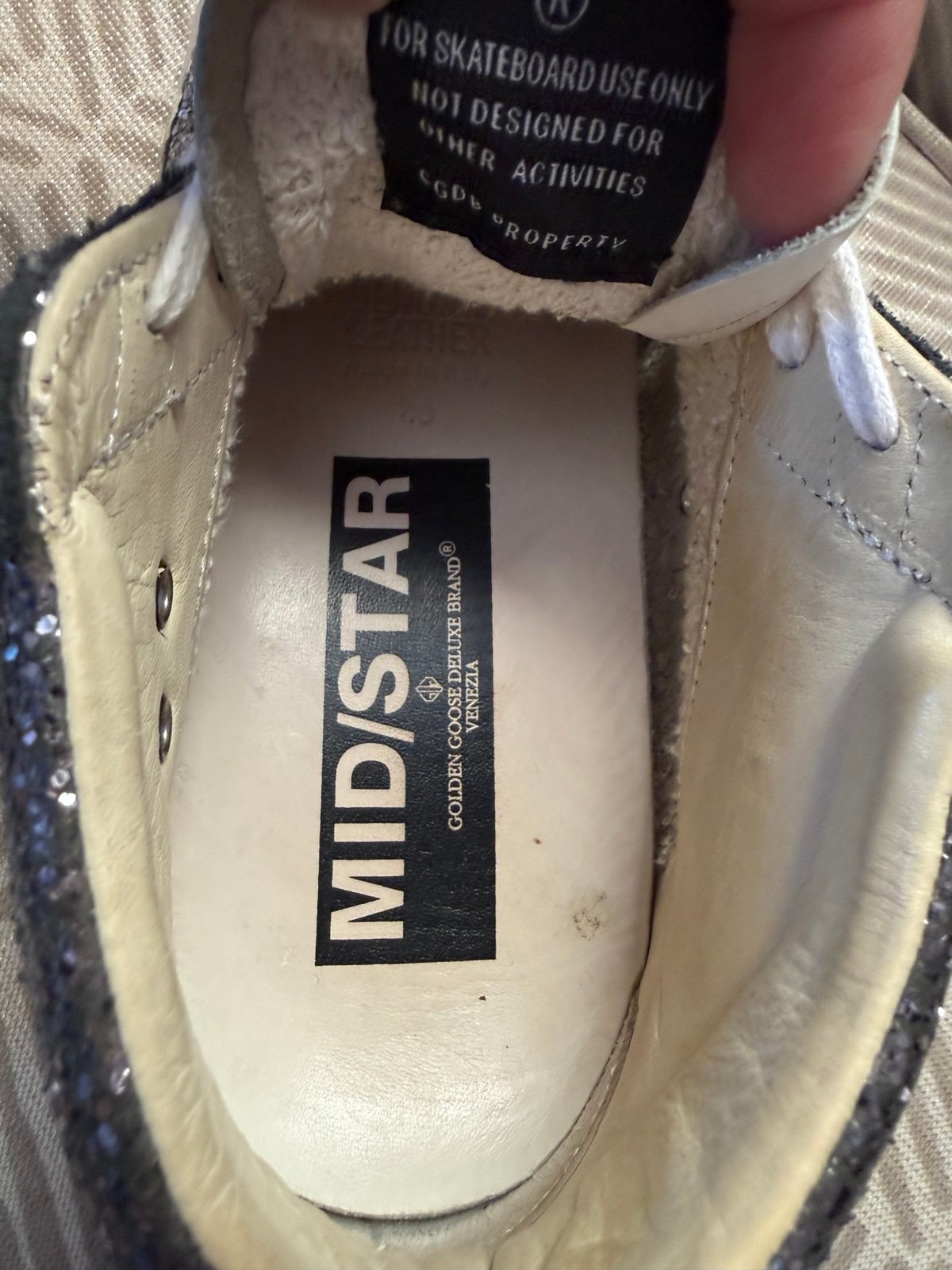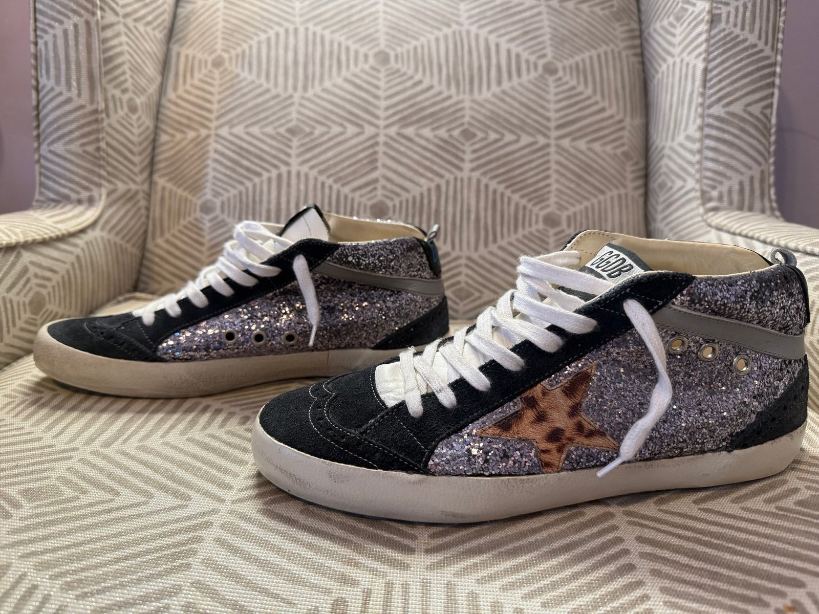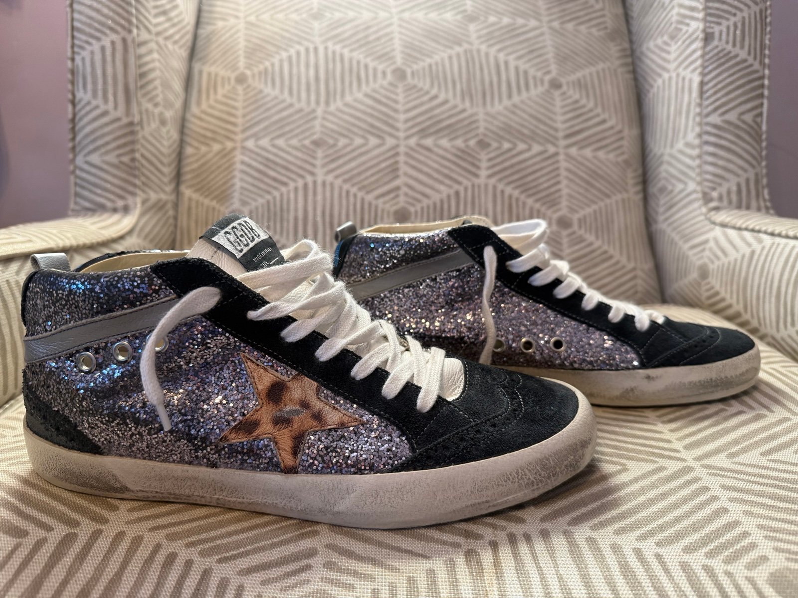 Authentic Golden Goose Mid Star sneakers in size 40. These stylish sneakers feature a silver glitter body with black suede accents and a leopard-print star. They are in good pre-owned condition with normal wear on the soles and a slight separation at the toe crease area (pictured) othat becomes noticeable when walking — does not affect wear or comfort.