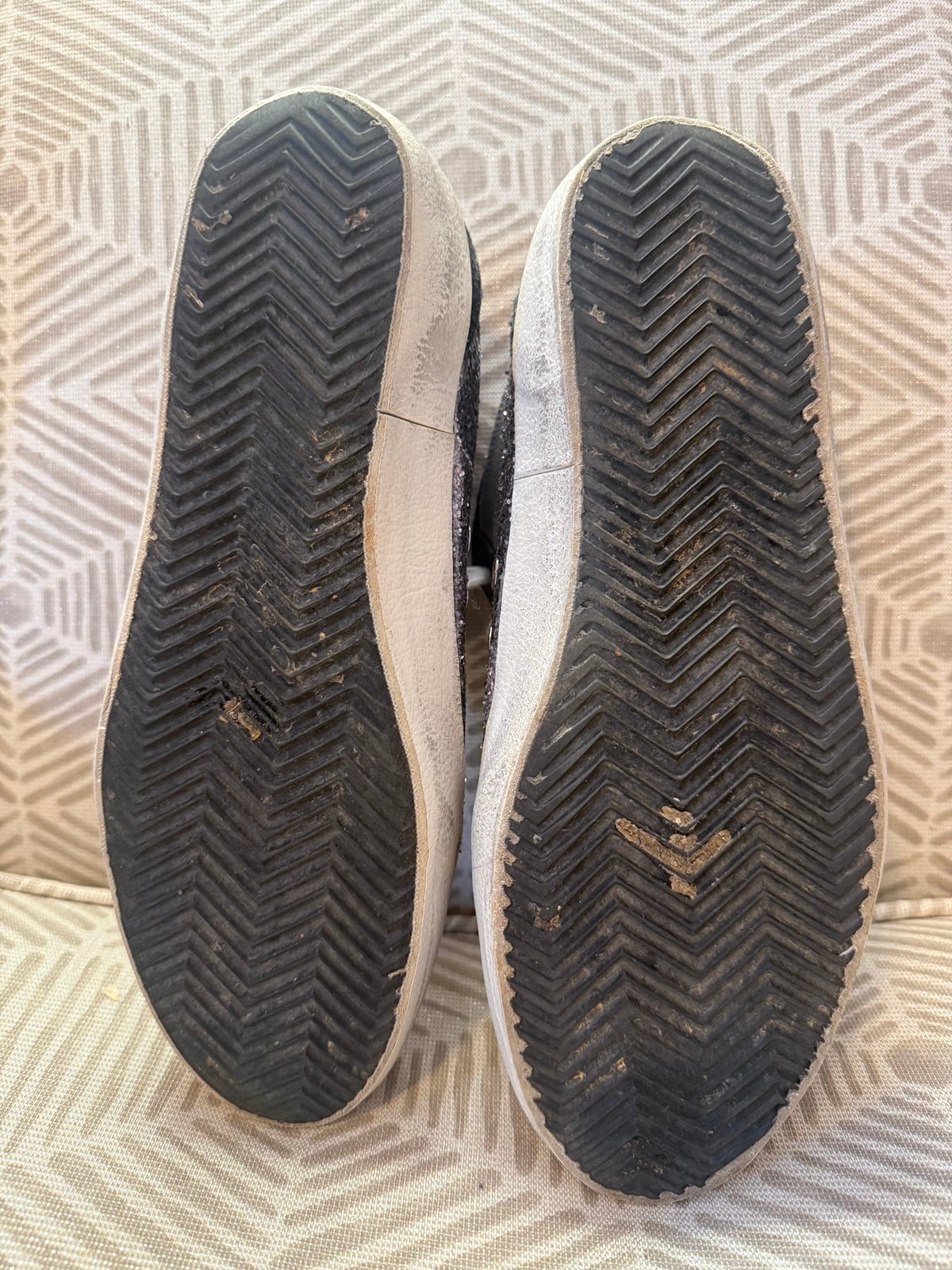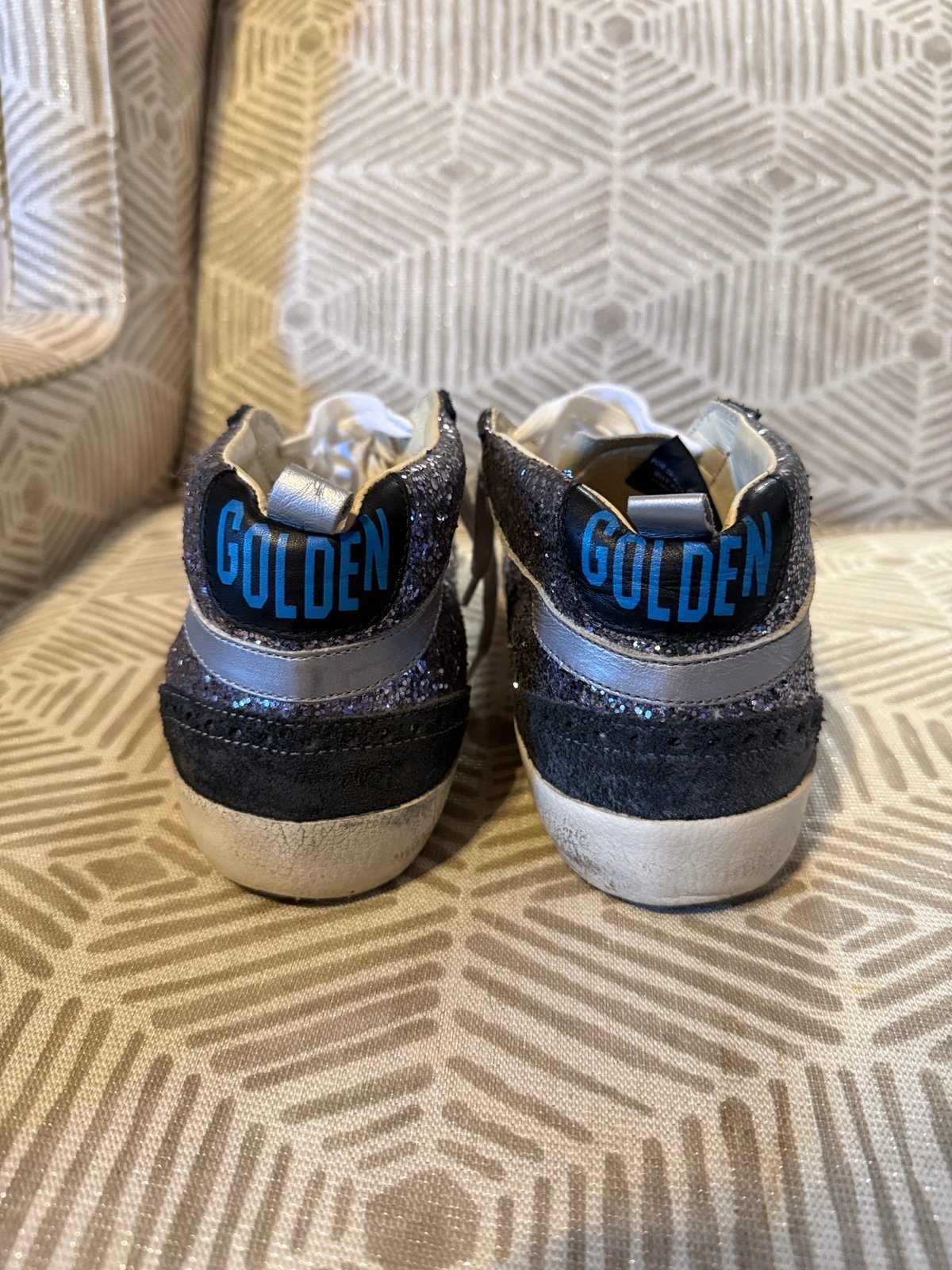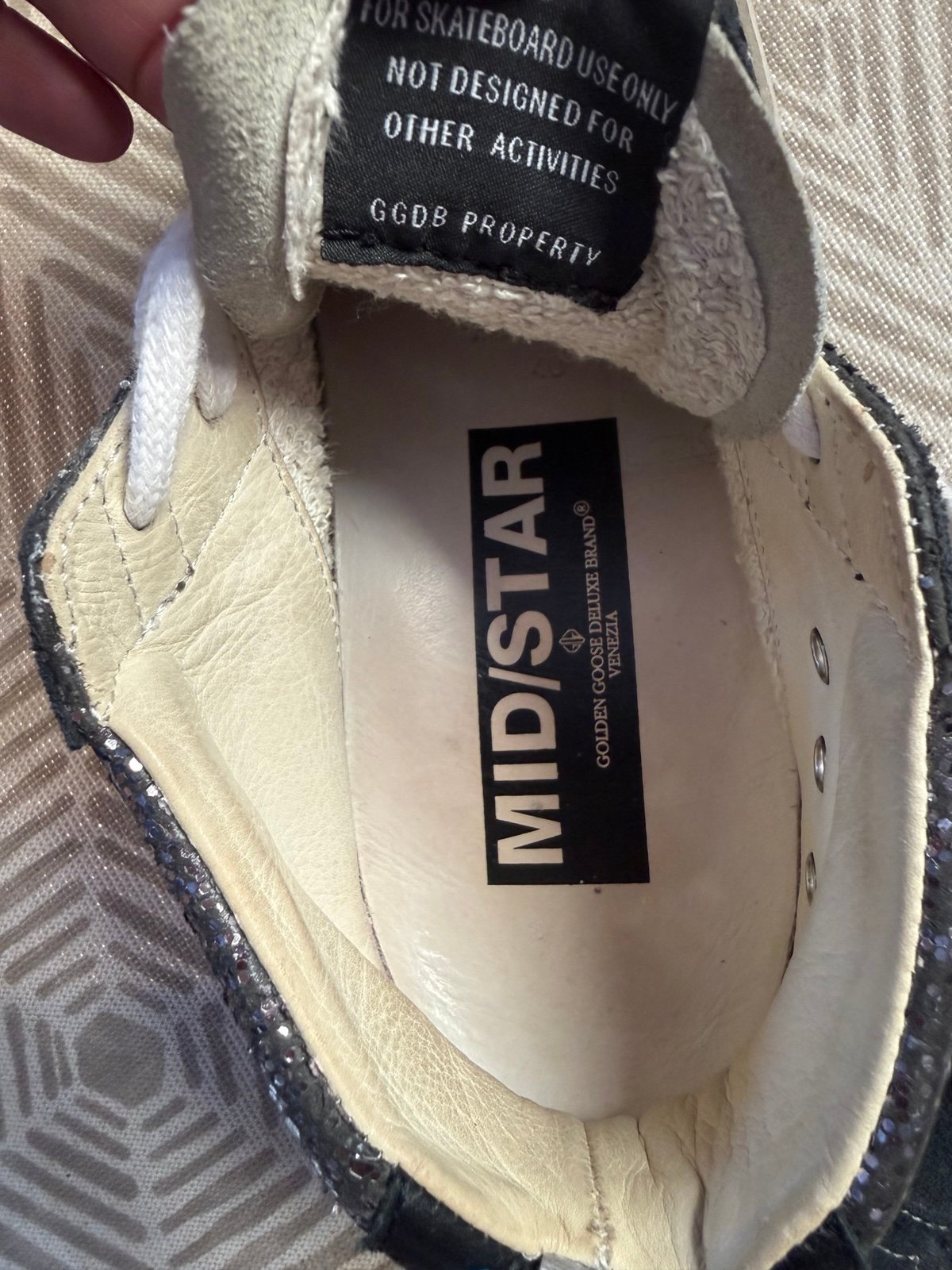 Authentic Golden Goose Mid Star sneakers in size 40. These stylish sneakers feature a silver glitter body with black suede accents and a leopard-print star. They are in good pre-owned condition with normal wear on the soles and a slight separation at the toe crease area (pictured) othat becomes noticeable when walking — does not affect wear or comfort.