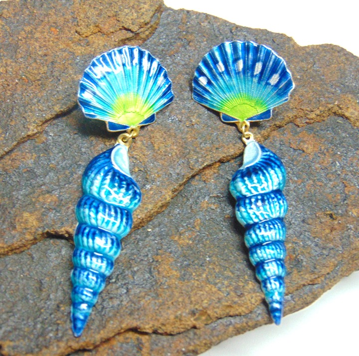Guilloche Sea Shell Earrings Vintage Blue Enamel Gorgeous BeadRage