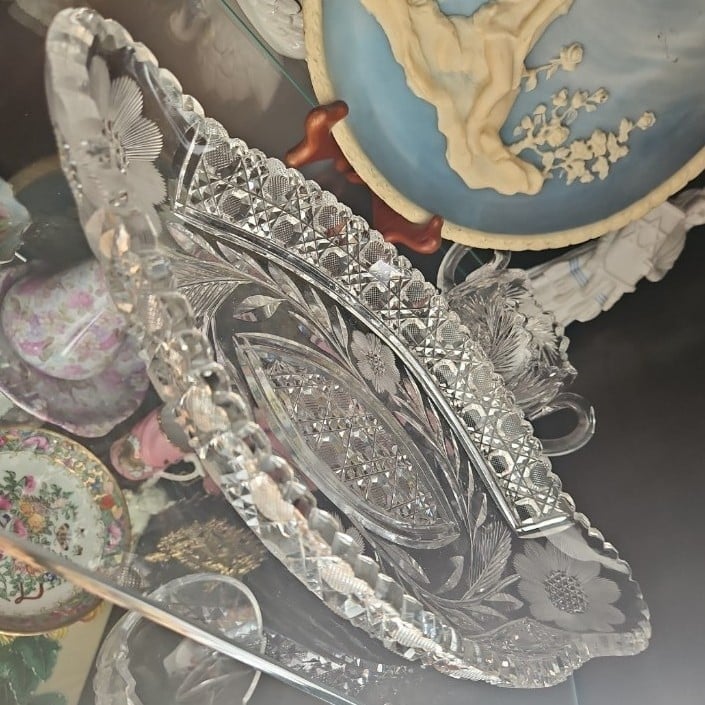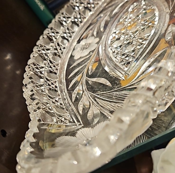 Etched frosted and deeply cut and decorated with sawtooth edge