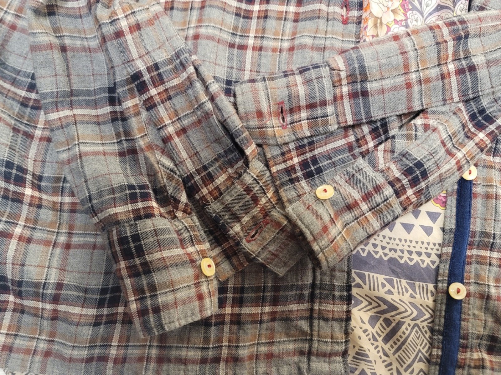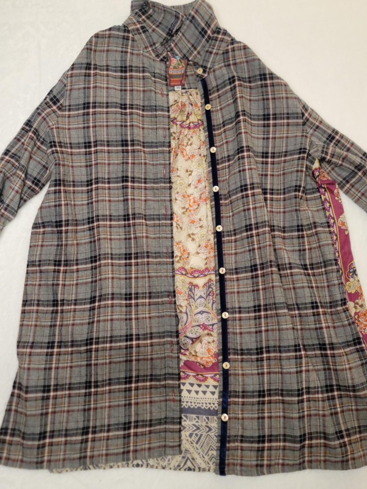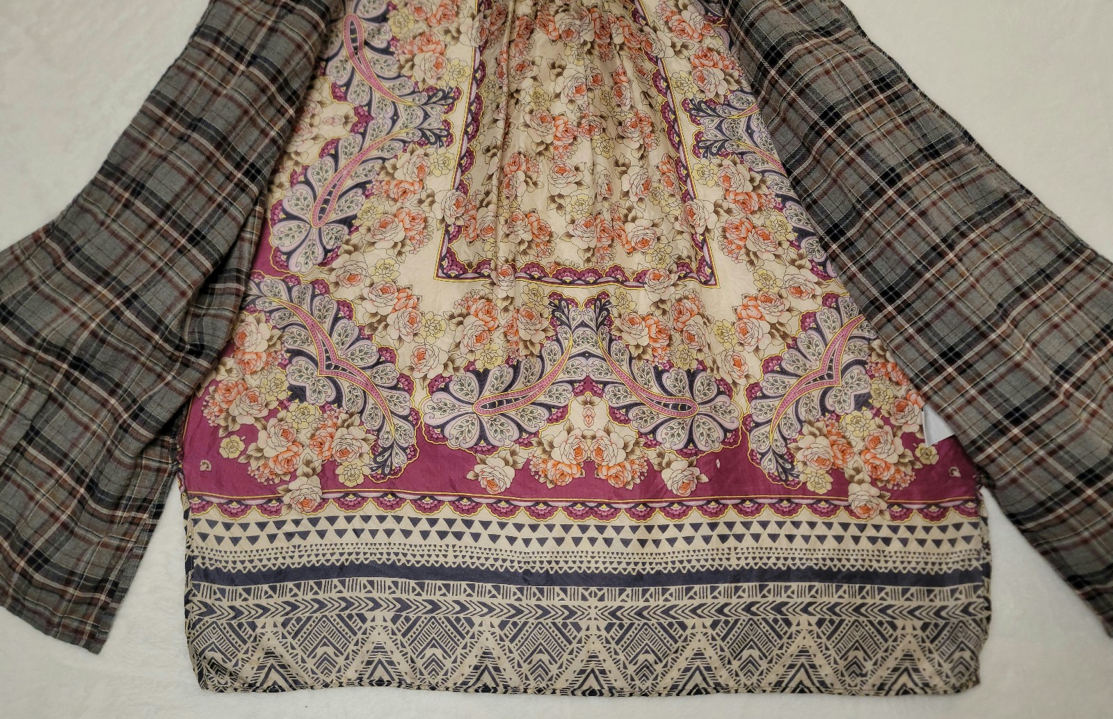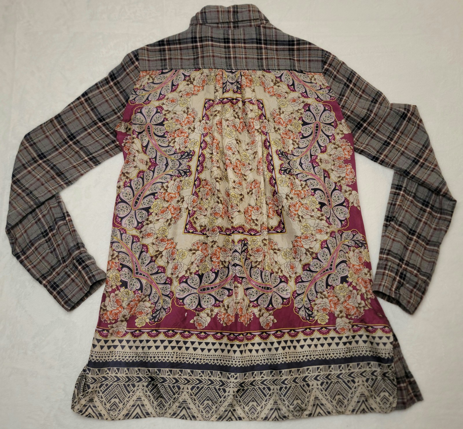 • Style: 7394 Bohemian top/blouse with a collared neckline, long sleeves with button cuffs, and button-up closure. Lightweight and split hem at the sides making this top breathable and flowy. Classic plaid pattern with a striking contrasting silk panel on the back. No stretch
