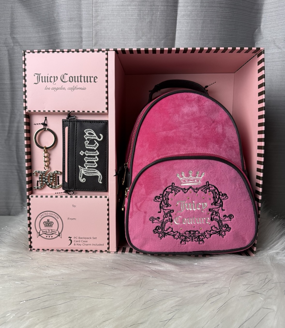 -super cute velour free love pink backpack with "Juicy couture" rhinestone crown logo embroidered on the front