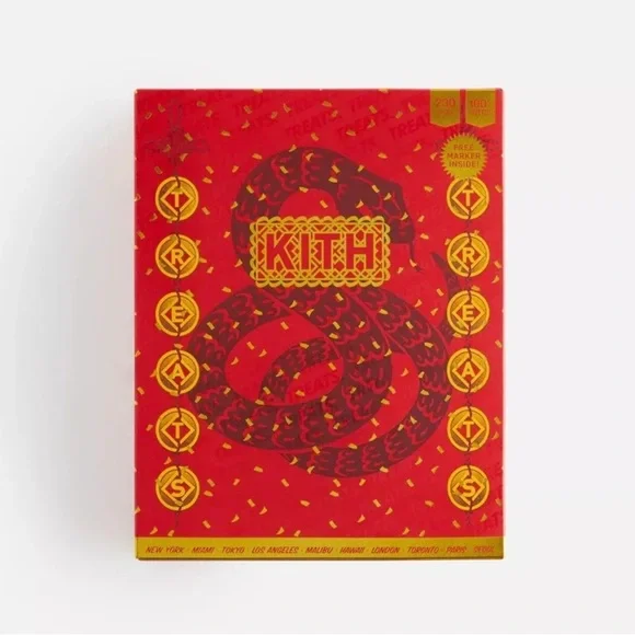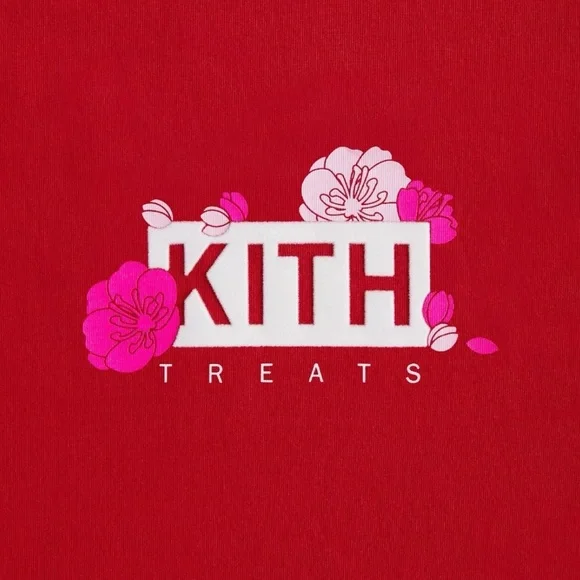 The KITH Treats Plum Blossom Tee is a limited edition t-shirt from the KITH Chinese New Year collection. This red t-shirt features a graphic print of a snake and plum blossom, symbolizing the Year of the Snake in the Lunar New Year. Made of 230GSM cotton with a round neck and short sleeves, the tee has the KITH Treats logo as an accent. This size Large shirt is designed for a regular fit, suitable for all seasons including summer, fall, and spring.
