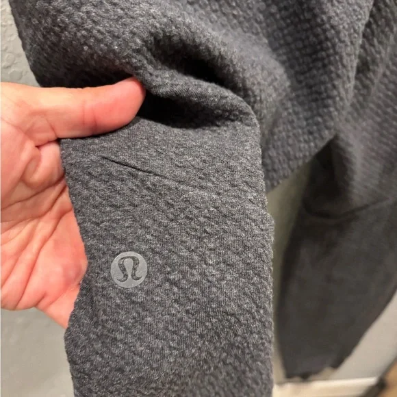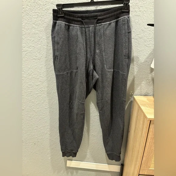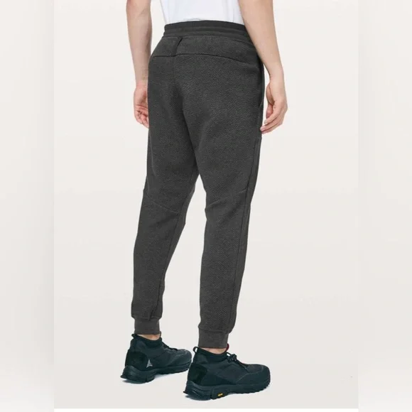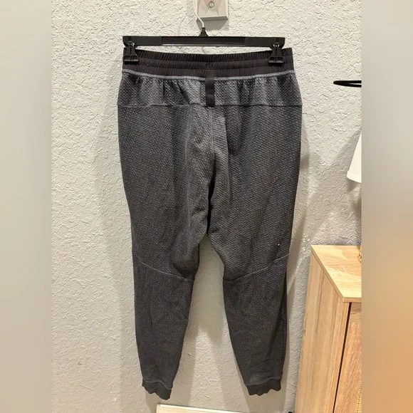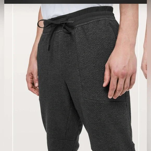 Lululemon At Ease JoggerHeathered BlackSize MIn perfect condition These textured joggers feel soft against your skin, whether you're warming up at the gym or hitting the streets post workout.Fabric is four-way stretch and naturally breathablefeaturesDesigned for: TrainingWaistband: Two tie options let you find you perfect fitSecured pockets: Secure your stuff in the exterior zippered pocketLocker loop: Tape detail at back doubles as loop for hangingMobility: Gusset is placed to allow increased mobilityFit: Slim, tapered fit