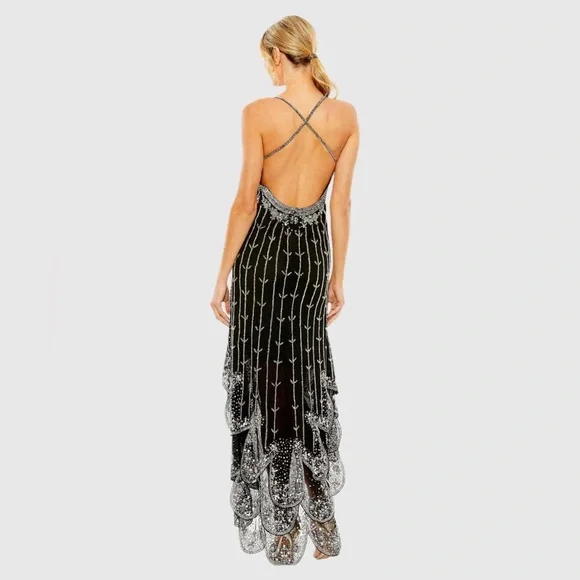 Mac DuggalColor: Black Fully lined through bodyScoop necklineSleevelessAll over intricate beading accented by jewelencrusted embellishmentsConcealed back zipperApprox. 52" from top of shoulder to bottom hem💕 store return Style #93962🌸 missing some sequins on strapTags: homecoming, pageant, date night, holidayparty, gala, wedding guest, military ball, photoshoot,engagement pictures, old Hollywood, red carpet,formal, evening gown, elegant, New Year's Eve, nye,army ball, marine ball, classy dress, black tie, charityevent, guest of wedding, prom, quinceanera, specialoccasionPlease note due to the intricate nature of the gown,it's possible there could be a slight flaw (loose string,missing bead or sequin, etc.) After close review, I'mnot finding anything major.