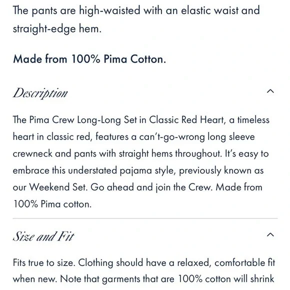 NWOT, Size Medium The Pima Crew Long-Long Set in Classic Red Heart, a timeless heart in classic red, features a can’t-go-wrong long sleeve crewneck and pants with straight hems throughout. It’s easy to embrace this understated pajama style, previously known as our Weekend Set. Go ahead and join the Crew. Made from 100% Pima cotton.