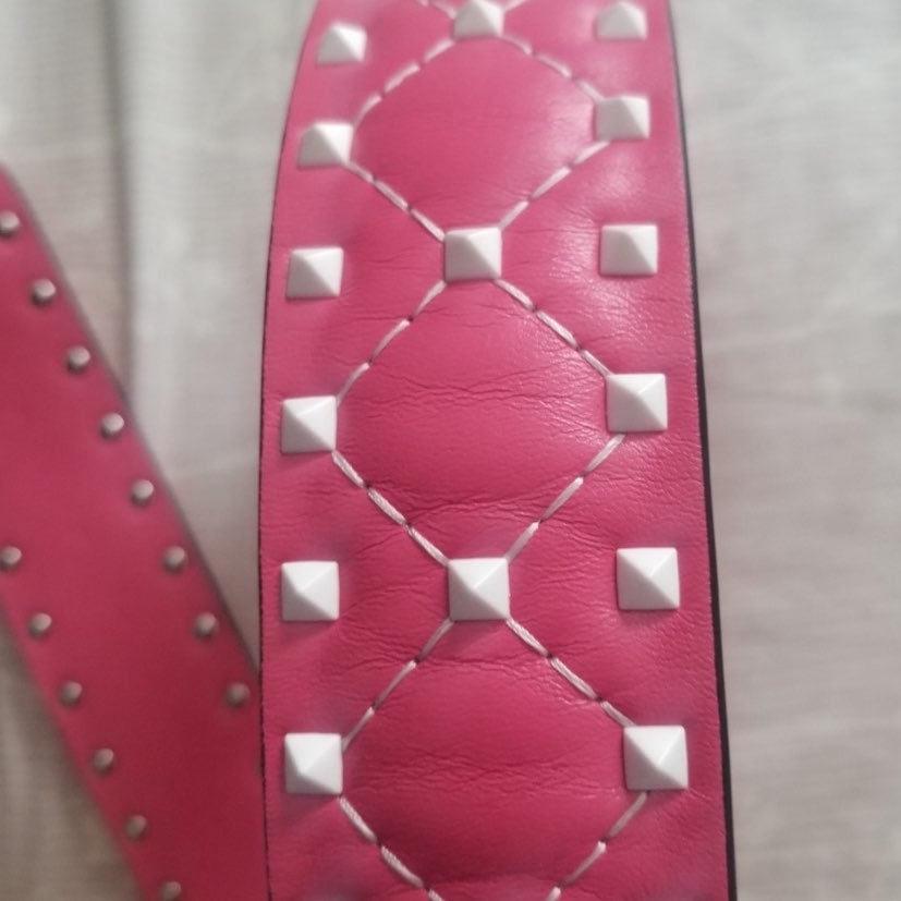 pink and white agneu leather replacement crossbody strap by VALENTINO GARAVANI. Pink agneu leather with contrast stitched tonal quilting, white pyramid rockstuds and white signature toggle clasp closures at both ends. NEW CONDITION, leather shows some impressions from the pyramid studs being pressed into the leather when the item was rolled up in storage as shown in photos.