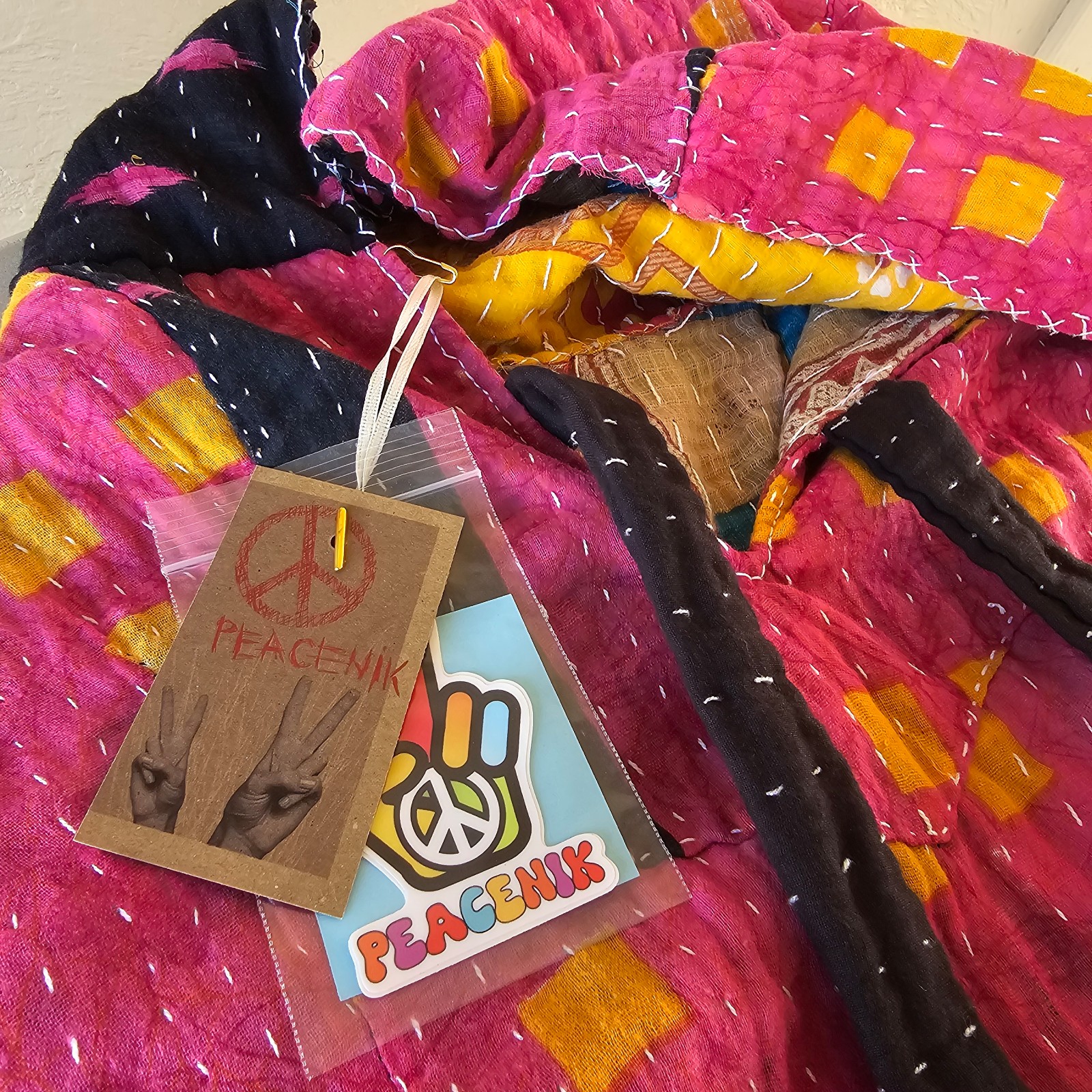 This is “Nomad Harmony,” Peacenik Originals No. 01 — a one-of-a-kind reversible Baja hoodie built entirely by hand in our Arizona desert studio from authentic, 3-layer vintage Indian Kantha quilts.