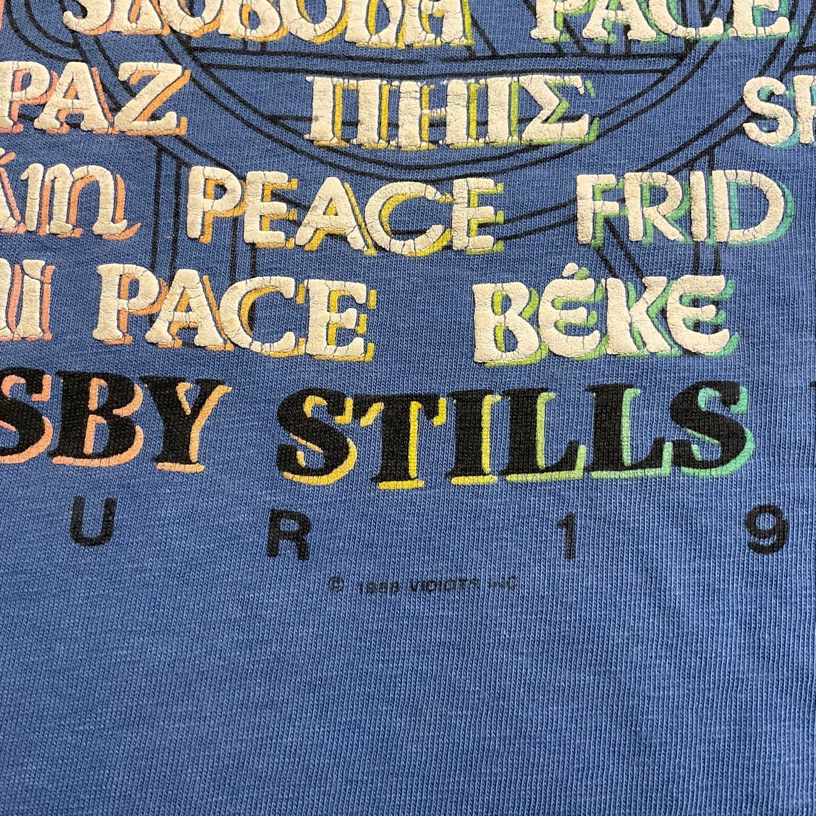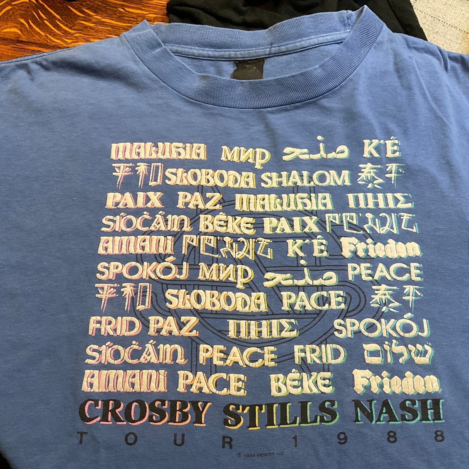 Apparently this is hard to find…sold out quickly on tour.34 years old and in darn good condition, the PEACE shirt in many of the worlds languages, North American Tour.it is deep sky blue, chest 46” length 26”. I machine wash my tees and hang to dry. Graphics are still strong. There is one small spot on front that may come out, as shown in pic 2. The tag is there but I can not read the label and could not find another for sale to check the maker. I am posting several tees from my concert going years and will be happy to bundle. Just check out my selling page and message me before buying. Thanks for your interest and feel free to ask questions.