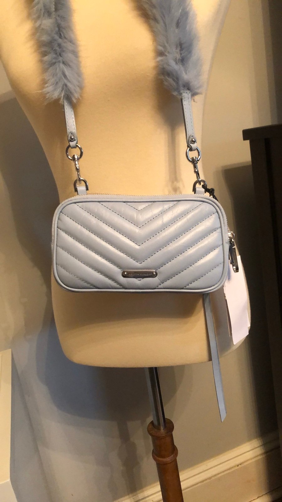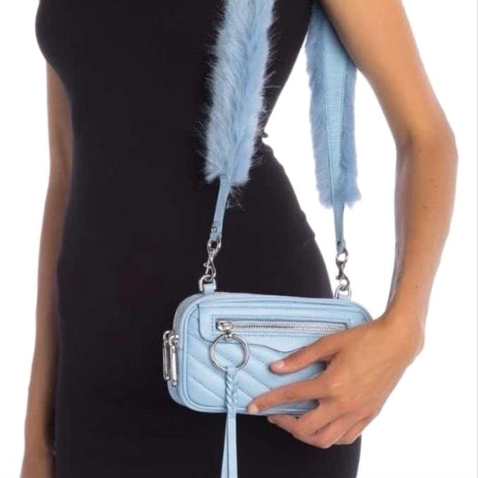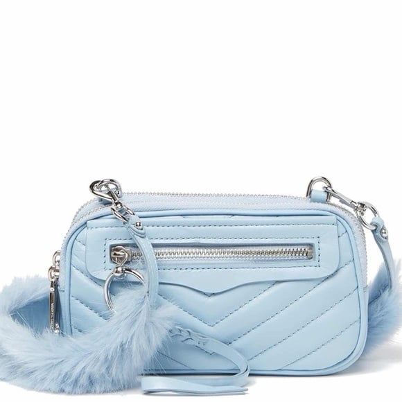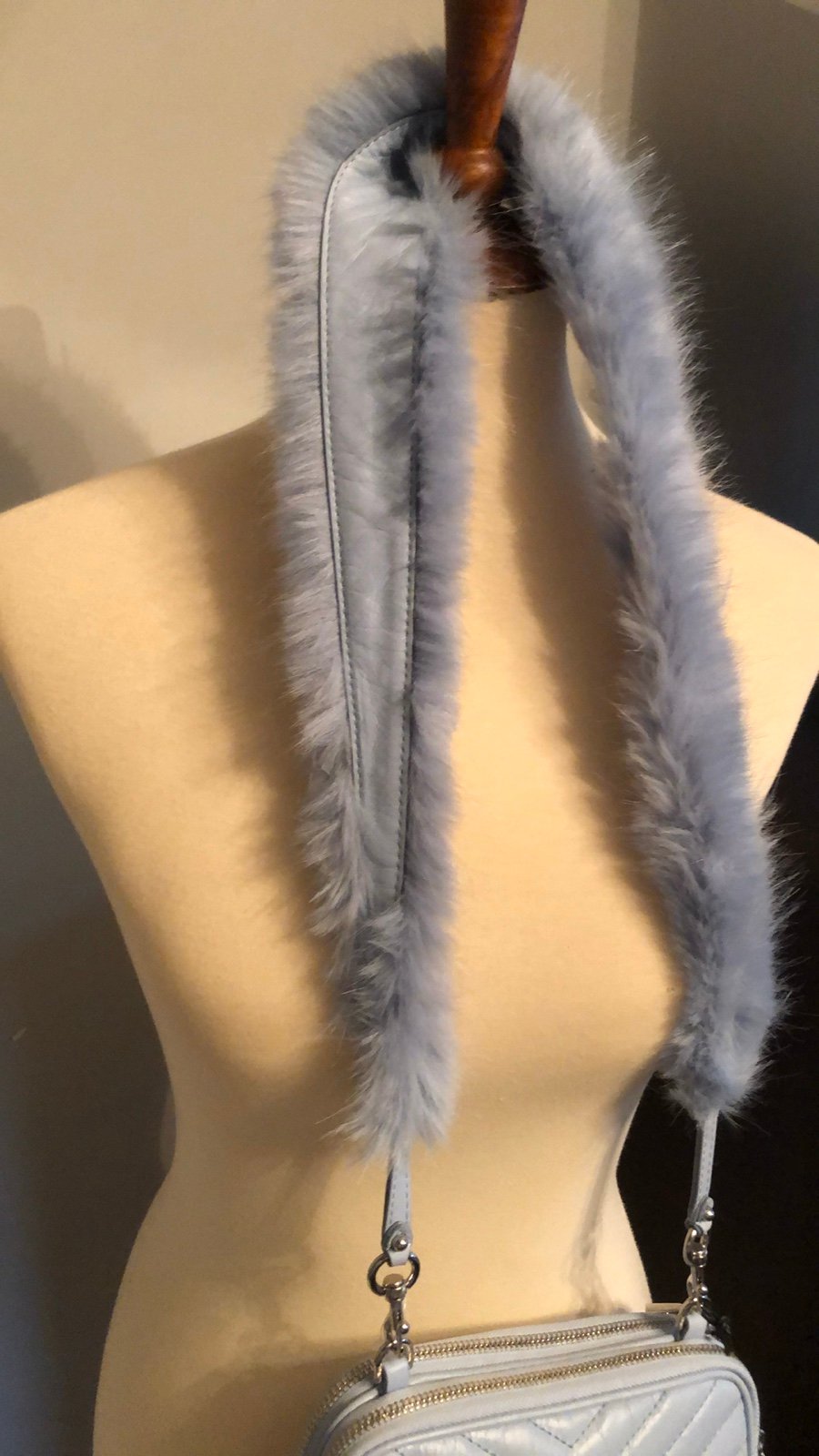 Soft creates an eye-catching crossbody bag that zips up two roomy compartments and an exterior zip pocket to keep you organized while on-the-go. A faux fur guitar strap adds an extra touch of luxurious style. Single detachable faux fur strap, Dual zip top closures, Exterior features 1 zip pocket, Interior features 1 slip pocket, 4.5" H x 8" W x 2.5" D, 23" strap drop. Leather and faux fur exterior, textile lining.Powder Blue. Comes with dust bag. Retail $298. Bundle items and save!