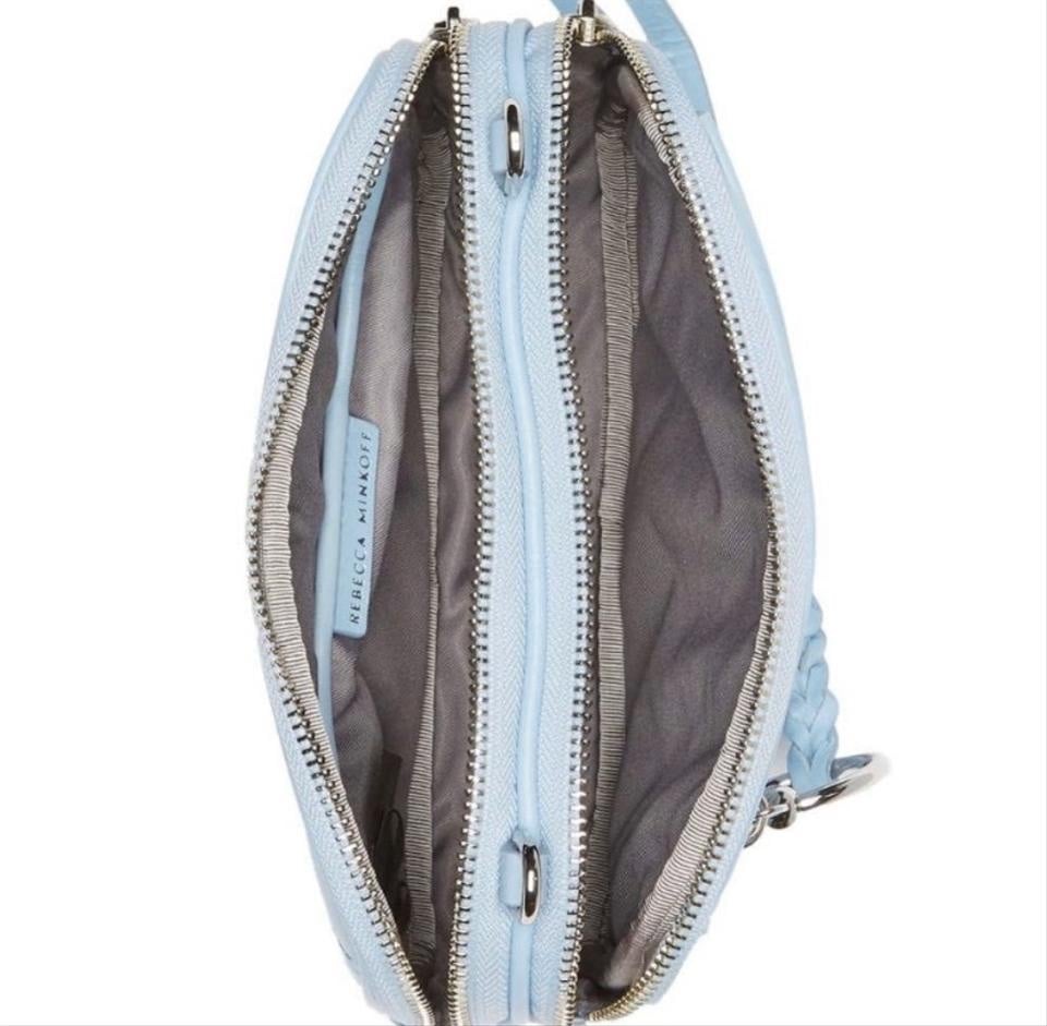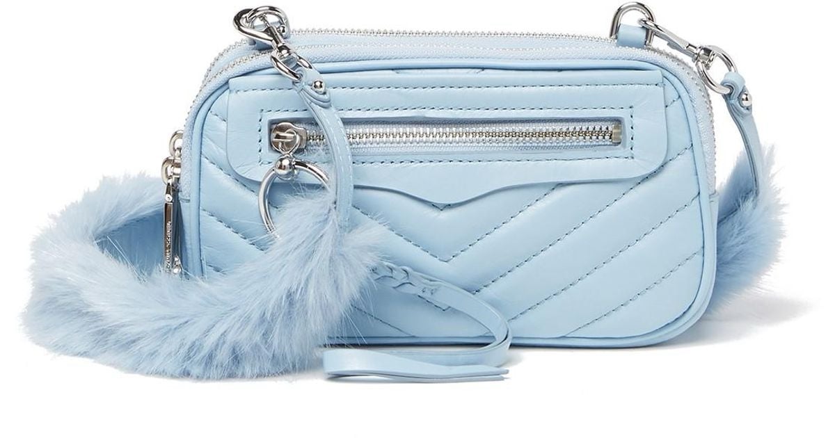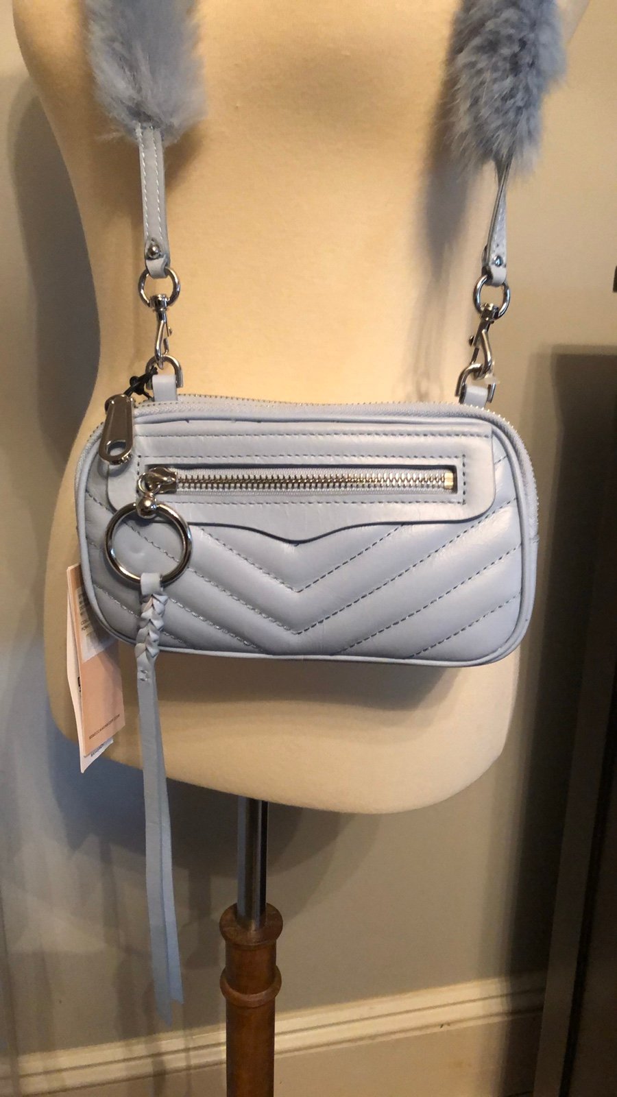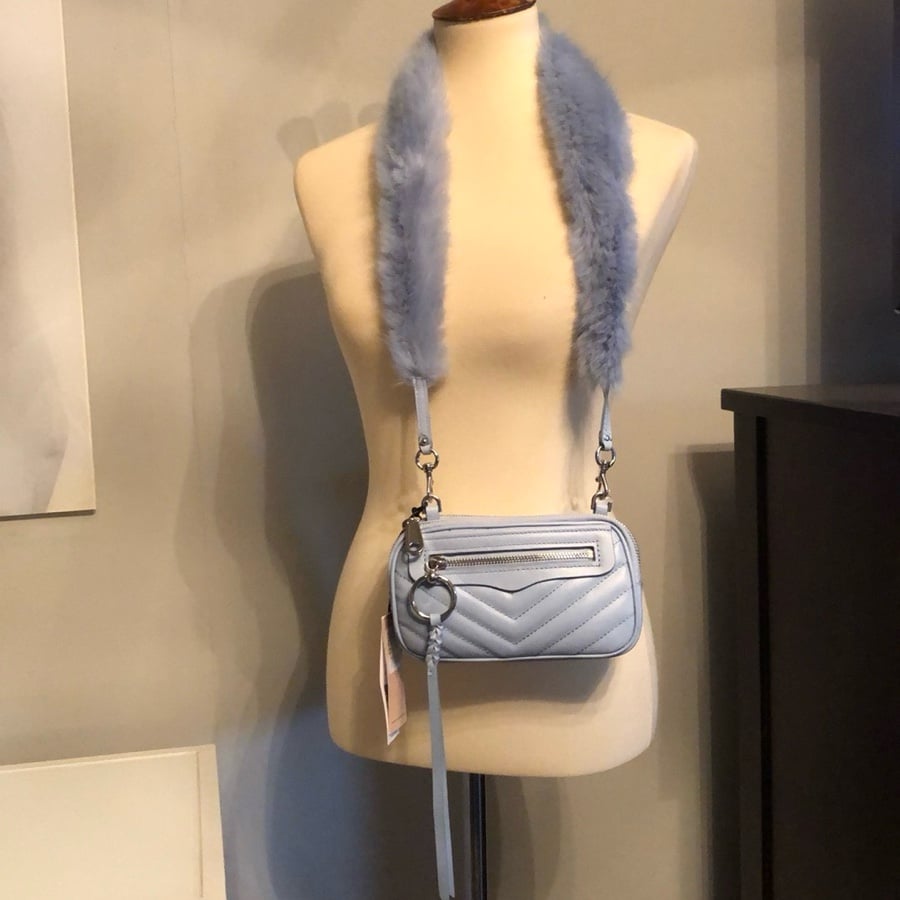 Soft creates an eye-catching crossbody bag that zips up two roomy compartments and an exterior zip pocket to keep you organized while on-the-go. A faux fur guitar strap adds an extra touch of luxurious style. Single detachable faux fur strap, Dual zip top closures, Exterior features 1 zip pocket, Interior features 1 slip pocket, 4.5" H x 8" W x 2.5" D, 23" strap drop. Leather and faux fur exterior, textile lining.Powder Blue. Comes with dust bag. Retail $298. Bundle items and save!