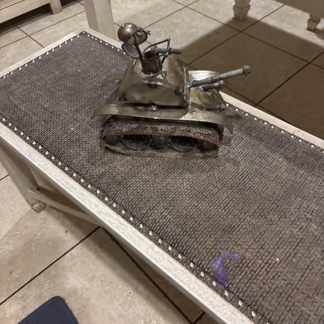 Unique recycled metal art sculpture featuring a tank with a grenade on top. This one-of-a-kind piece is crafted from various metal components, showcasing intricate detailing and a raw, industrial aesthetic. Perfect for collectors of steampunk art, military memorabilia, or unique home decor. This piece can be a standout addition to a desk, shelf, or display cabinet. The metal has a natural, aged patina adding to its character.
