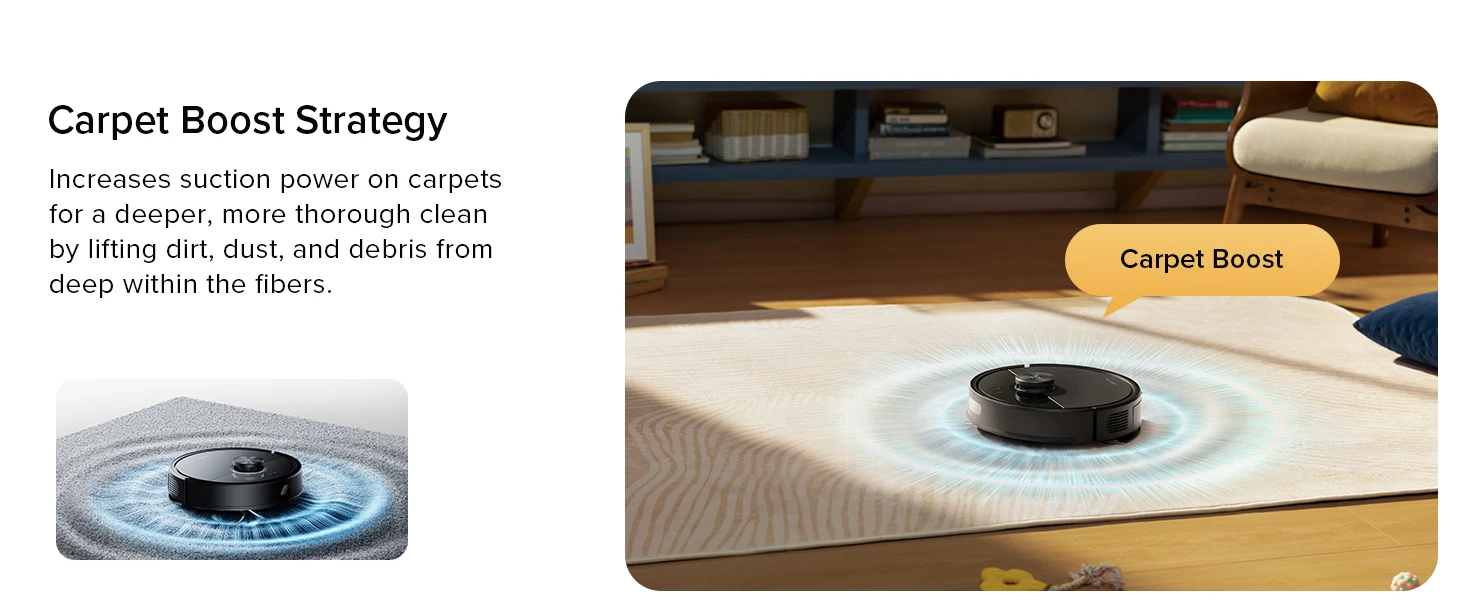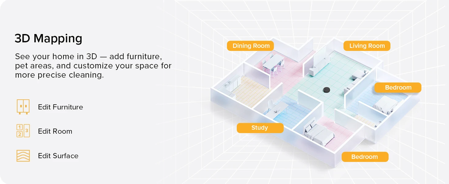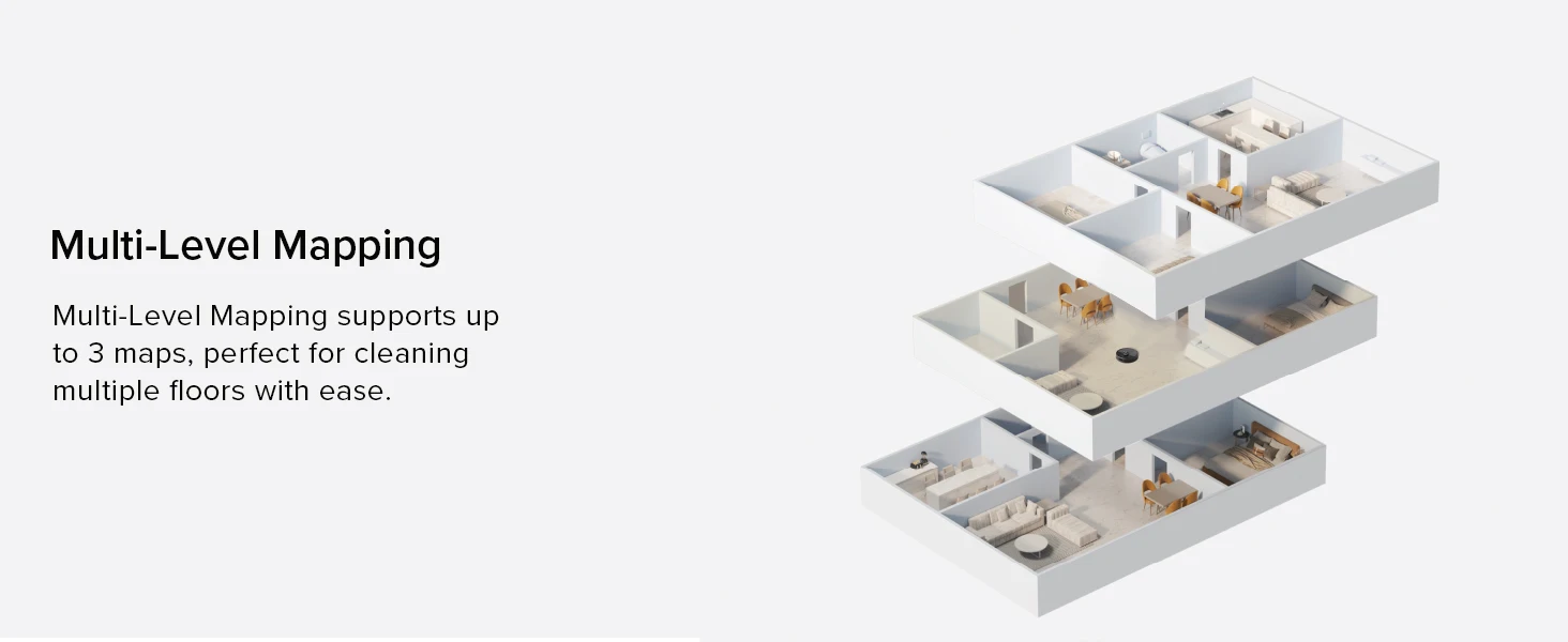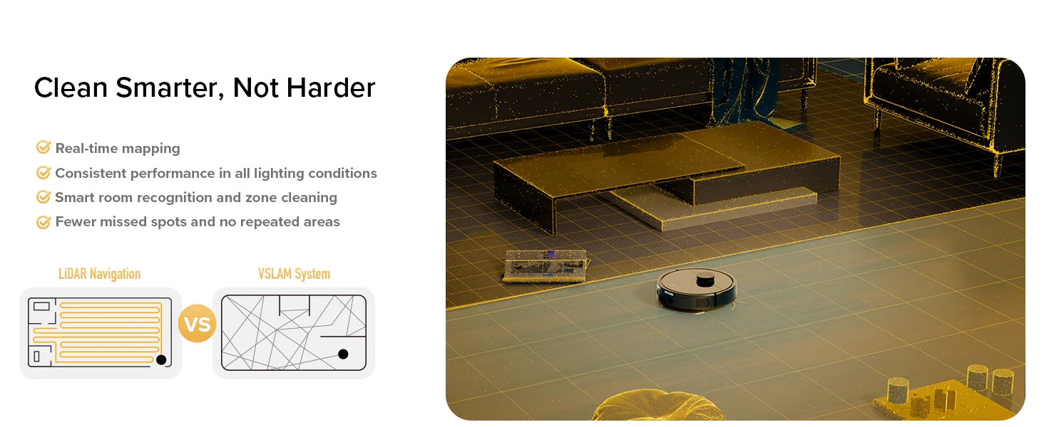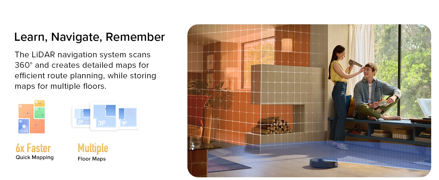 PreciSense LiDAR maps your home with precision, ensuring efficient and thorough cleaning. Its real-time mapping technology enables optimized cleaning paths, perfect for homes with pets and multiple rooms.