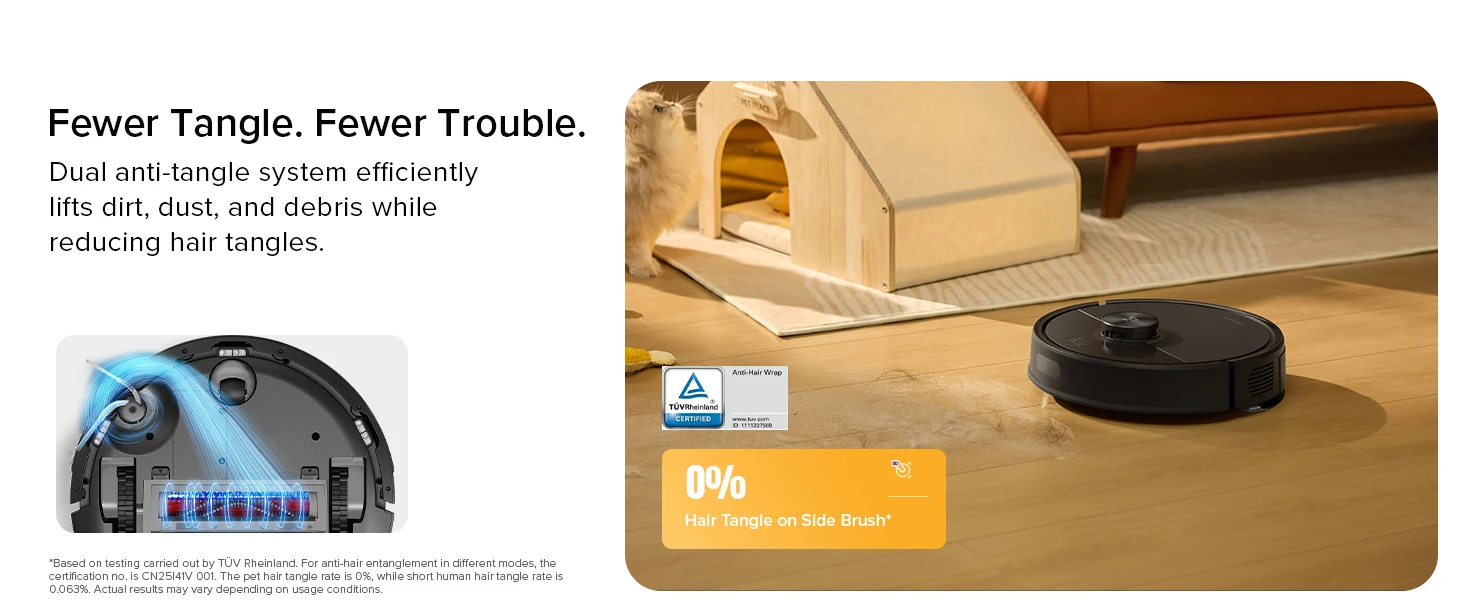 Spend less time detangling and more time enjoying your day. The JawScrapers main brush and 0% hair-tangling side brush resist pet hair wrap, even from long-haired breeds. With fewer cleaning interruptions, your robot stays ready with minimal effort.