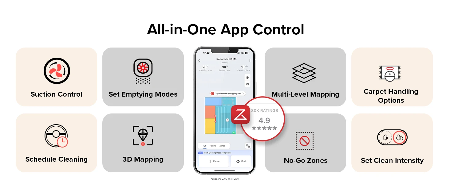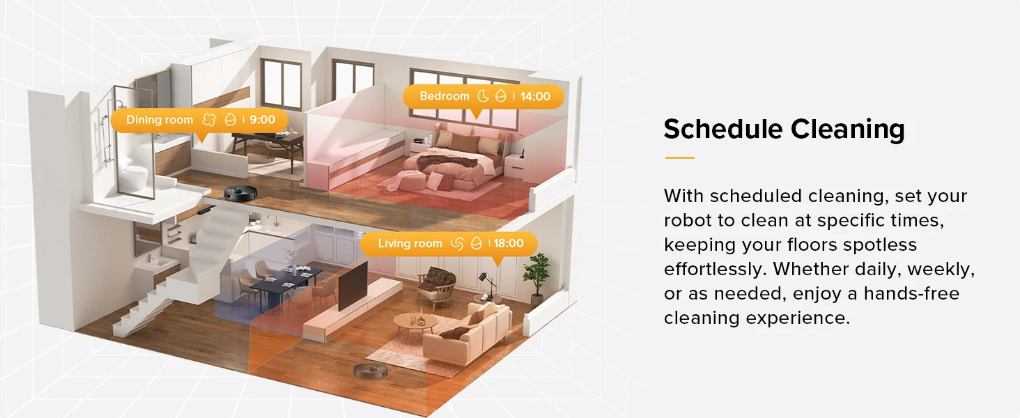 Automate your cleaning routine with scheduled cleanings, start a quick spot clean when needed, set no-go zones around pet areas, and monitor progress and battery life in real time. All of these features are easily accessible from your smartphone, offering you greater convenience and control. Please note that the app supports 2.4GHz Wi-Fi only.