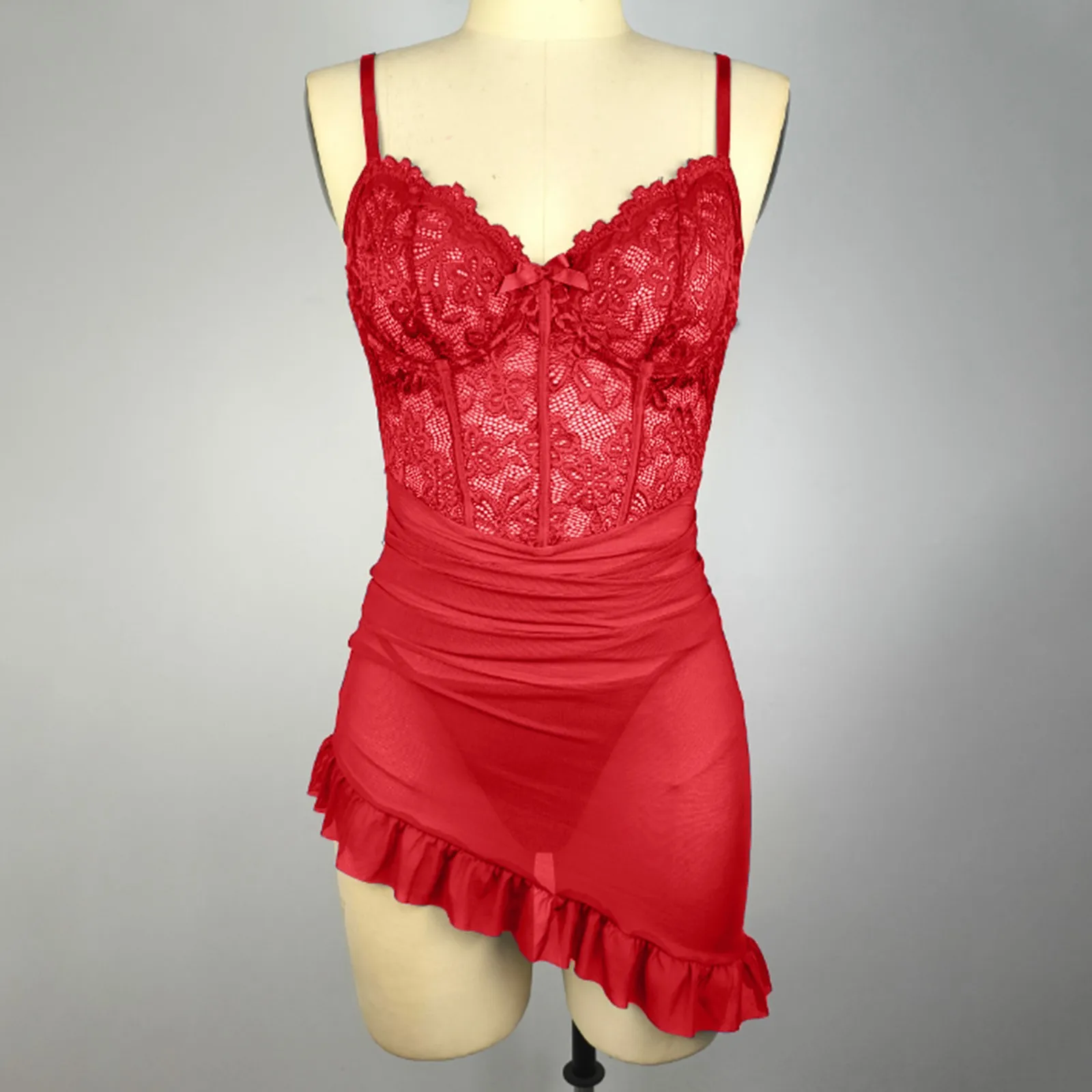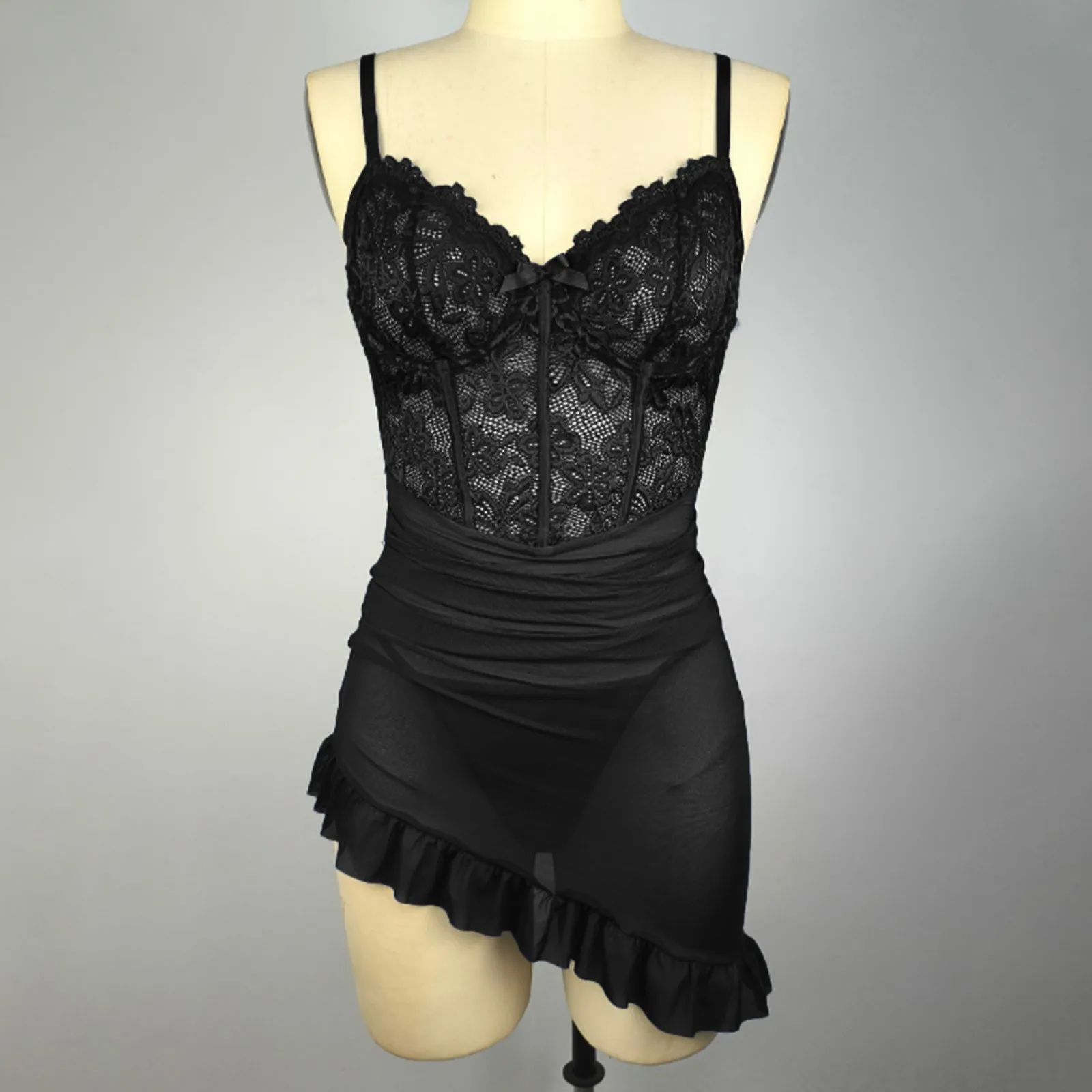 Sexy Lingerie For Women Mesh Babedoll Dress With Underwire Push Up Bra Lace Chemise Ruffle Hem Sleepwear