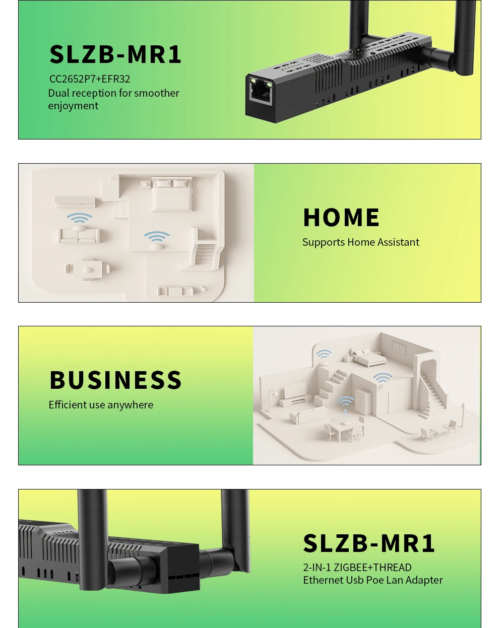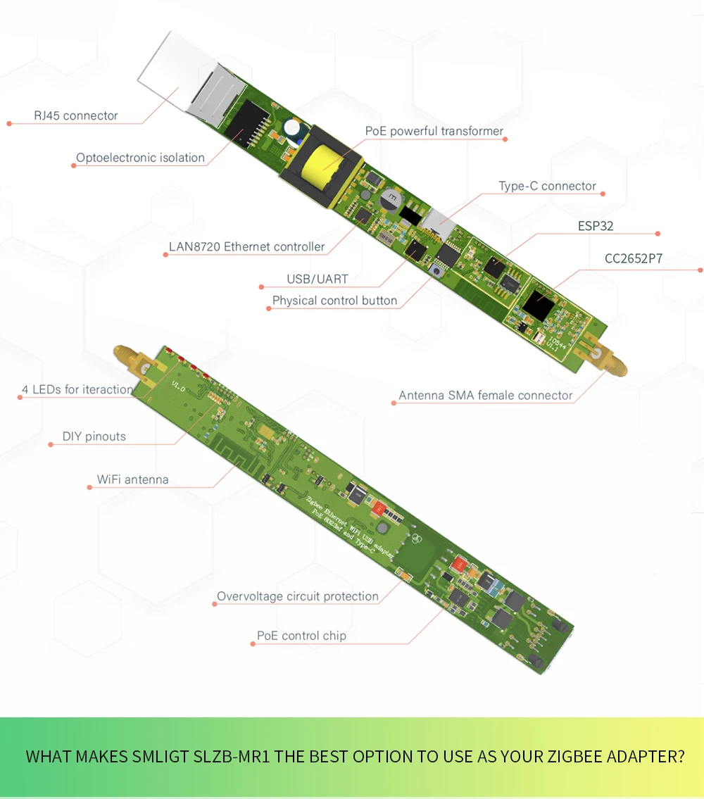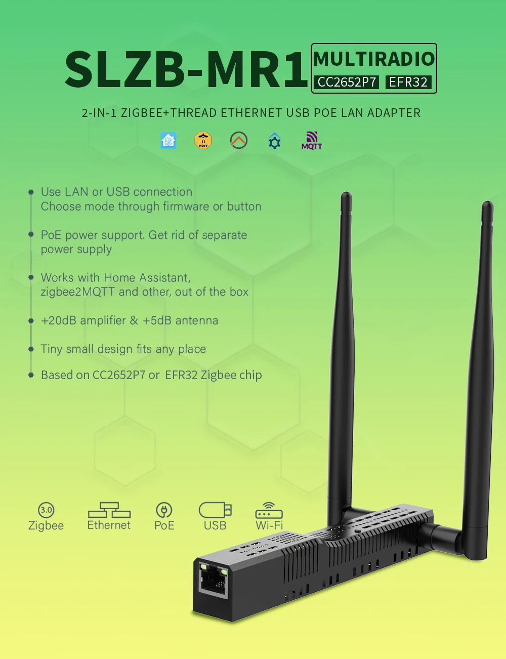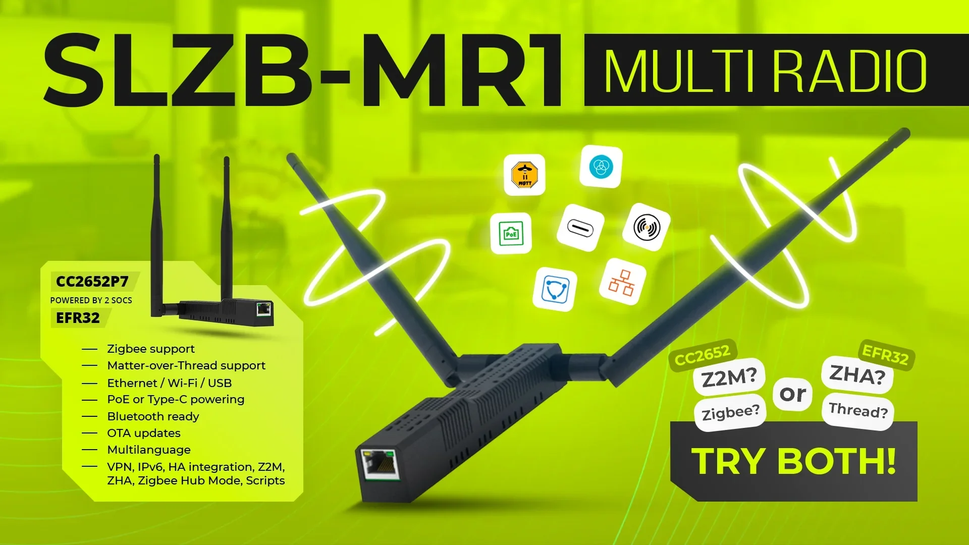 The SLZB-MR1 is SMLIGHT’s new coordinator, combining CC2652P7 and EFR32MG21 chips in a single device to deliver full support for both Zigbee and Thread networks. Designed to work seamlessly with Zigbee2MQTT and ZHA, the SLZB-MR1 offers unmatched flexibility for your smart home setup. Whether you're building a pure Zigbee network, experimenting with Matter over Thread, or want the freedom to switch between ecosystems, this multiradio coordinator brings it all together - in one powerful solution.