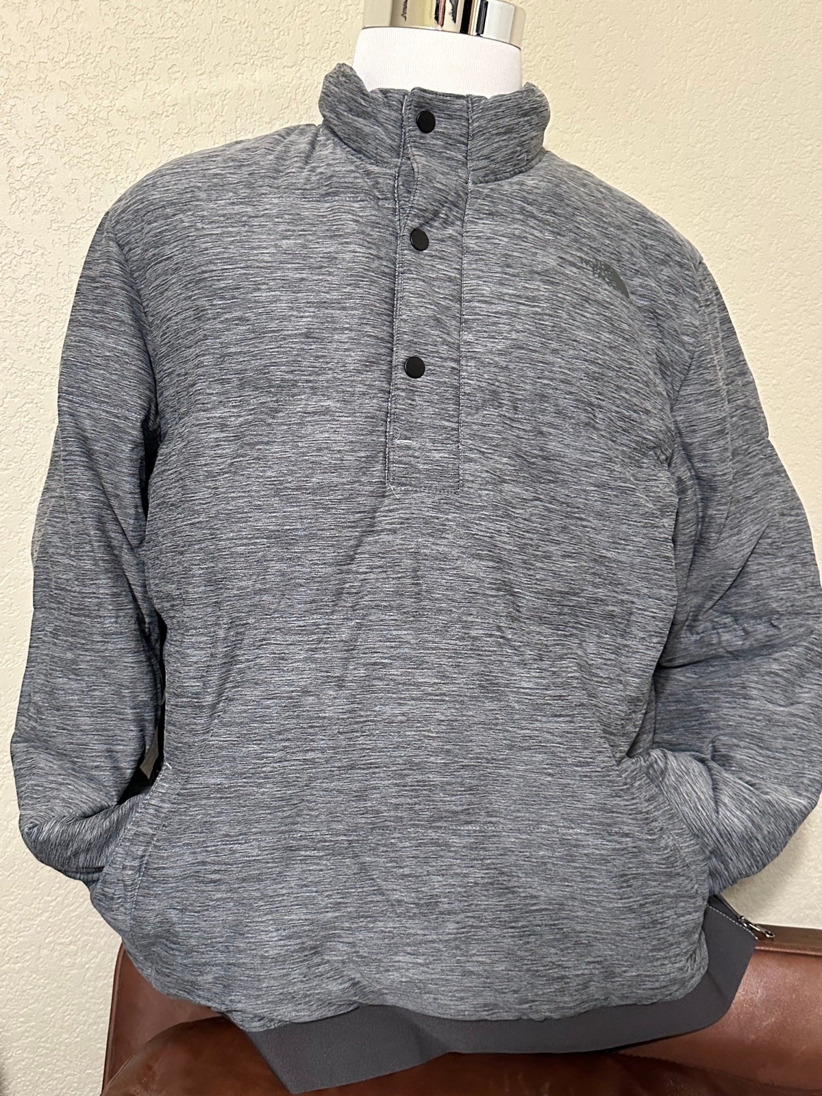 Sweatshirt style jacket with 2 front zippered pockets that open into front pouch pocket