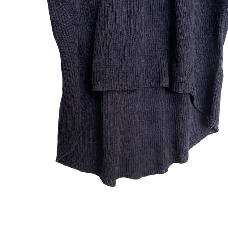 Premium Theory navy linen knit top with a relaxed, modern silhouette. Lightweight with a soft drape and subtle sheen — perfect elevated basic for year-round wear. Slight cap sleeves, ribbed texture, and high-low hem for effortless style.