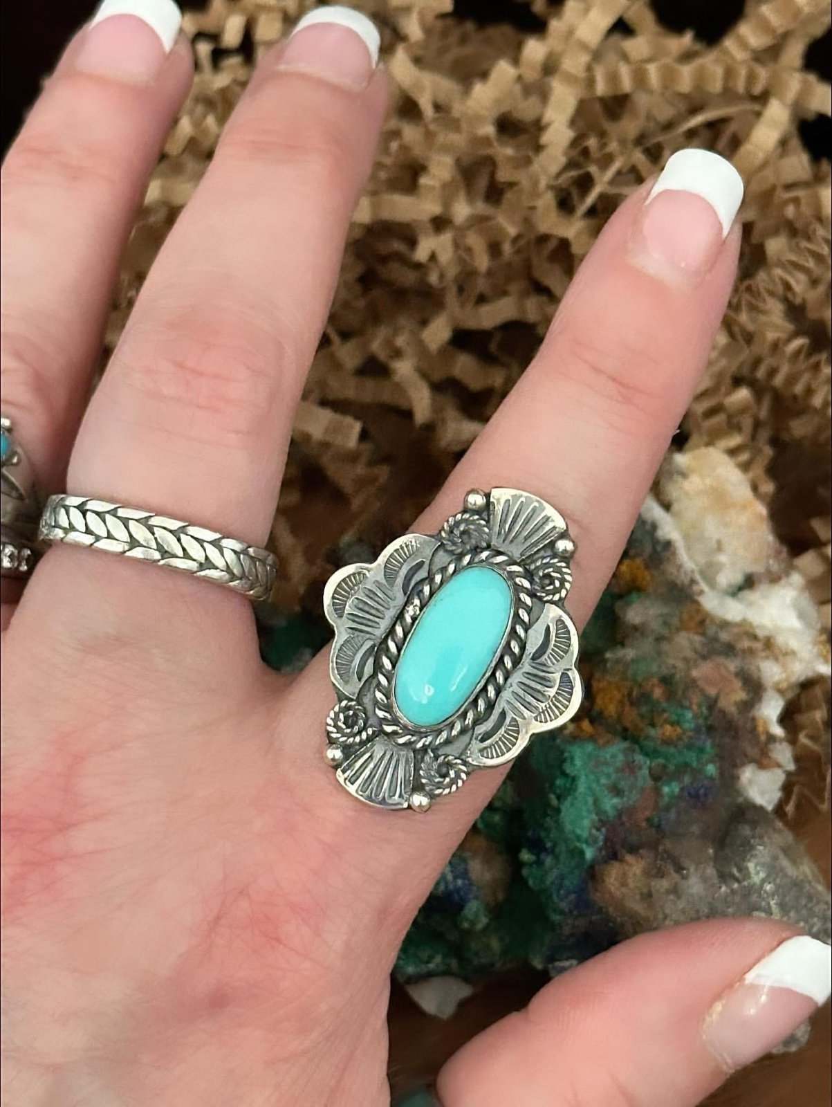 Wow.. that setting is everything! Beautiful blue turquoise what you see in the picture is not a chip. It is inclusion coloring of the natural stone. Guaranteed 925 solid sterling silver with gorgeous detailing and this beautiful ring Sterling back as well size 8.75. New .