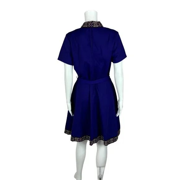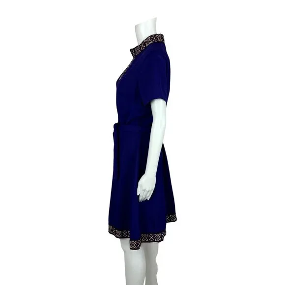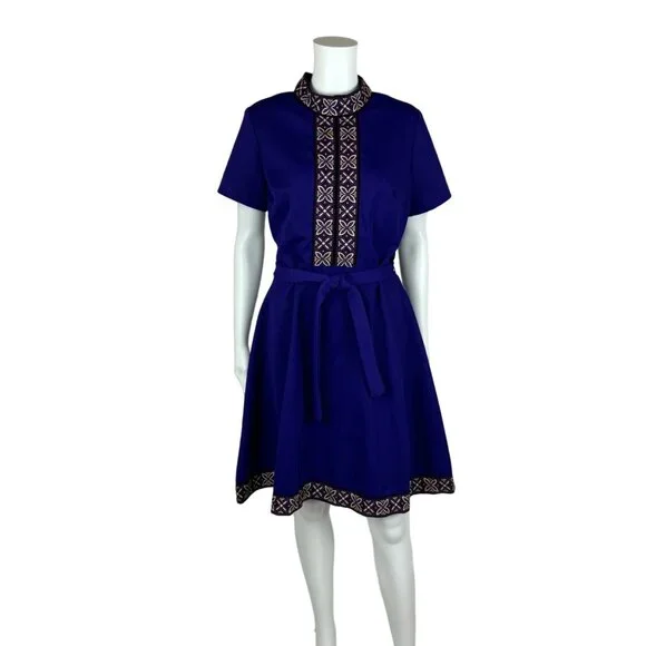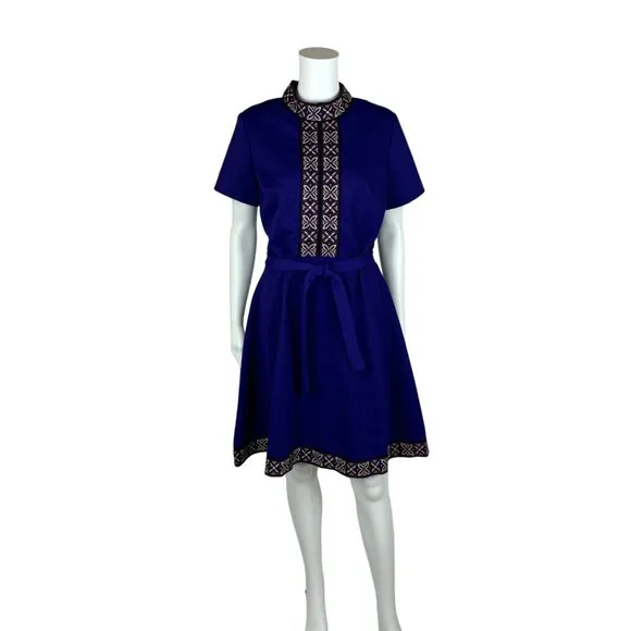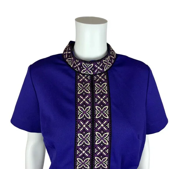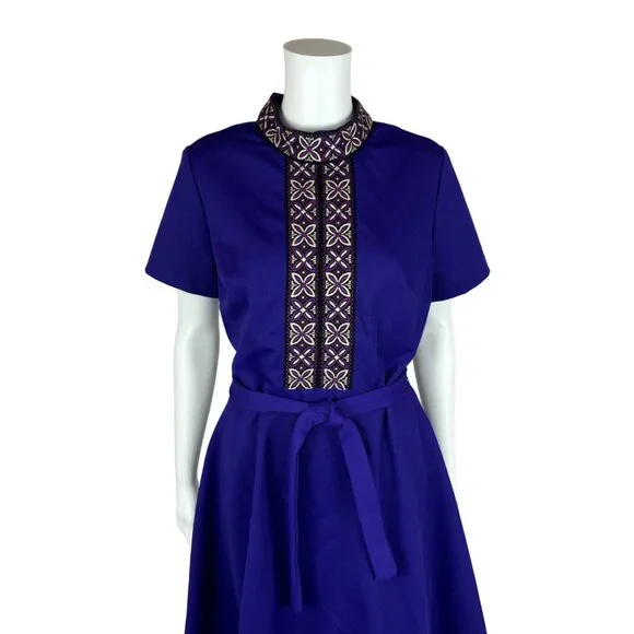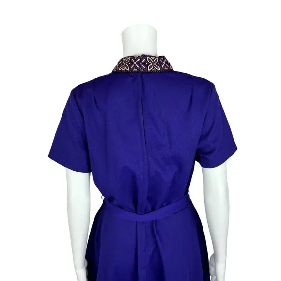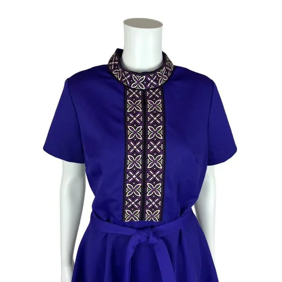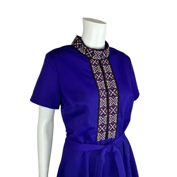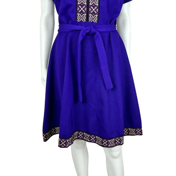 Vintage 70s Mini Dress Women's Medium Purple Babydoll Embroidered Trim Fit And FlareDress zips up the back with a metal zipper and has a matching tie belt.LABEL: -FABRIC: feels like polyesterMARKED VINTAGE SIZE: -SHOULDERS: 15"SHOULDER TO WAIST: 17"SLEEVE LENGTH: 8"BUST: 40"WAIST: 32"HIPS: 44"LENGTH: 38"CONDITION: great, see photos- has a couple looser threads at waistline which occurs with this type of heavy polyesterPINNED TO MODEL?: no☝For reference Mod's measurements are S 11", B 32.5", W 24", H 32.5"☝