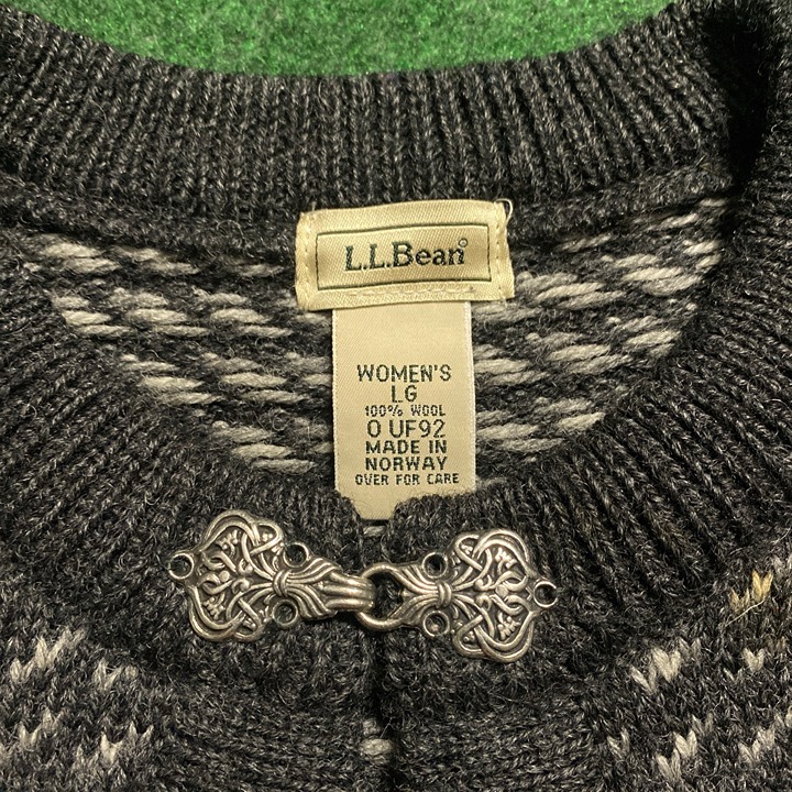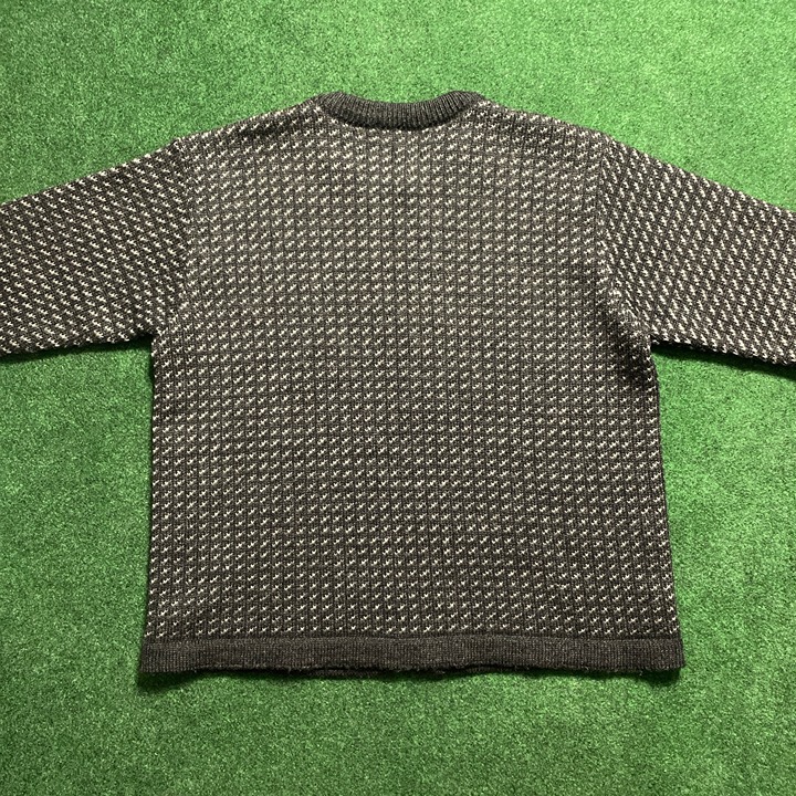 - The dark-gray, long-sleeve, button-down, crew-neck sweater features a speckled knit design and pewter accent clasp