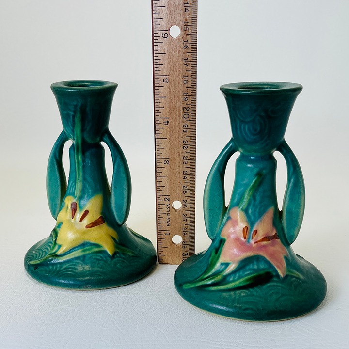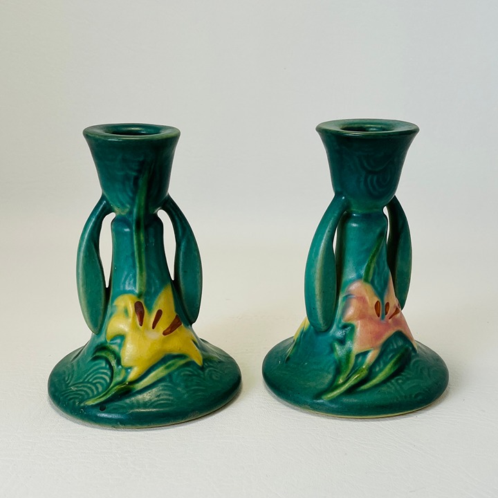 Roseville Art Pottery Zephyr Lily Candlesticks 1163-4 1/2 in evergreen. Introduced in 1946. Out of Zanesville, Ohio, a zephyr lily is found on two sides, one yellow, the other pink with slender embossed leaves. An embossed swirl pattern is seen in the recessed areas of the vase body; two handles come off the main body. Finished in a matte glazed. Very collectible.
