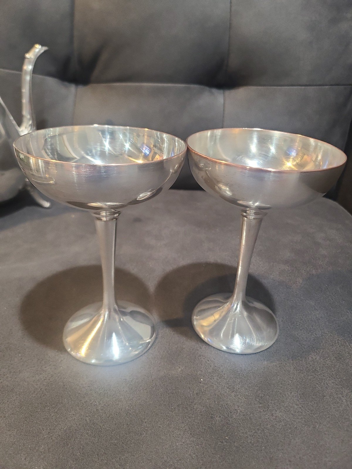 Vintage Leonard silver plate tea pot, sugar bowl and creamer bowl with lid. 2 international silver Co. Champagne wine goblets. 11in w.m. rogers silverplate tray. 1 italy silver plate ice cube tongs. Over all in good condition.Buyers are responsible for viewing and zooming in all posted pictures and thoroughly reading the item description prior to buying. If you have any questions or need more information, please send me a note and I'll be happy to help you as best I can.
