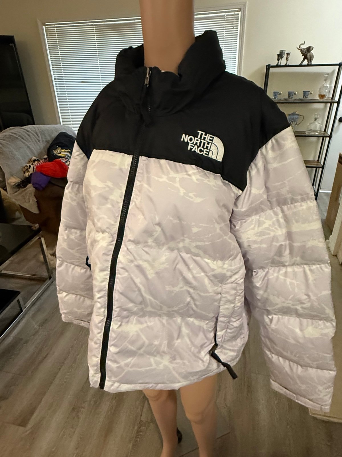 The Women's The North Face Nuptse 1996 Retro Short Cropped Puffer Jacket in size 2XL is a stylish and retro-inspired outerwear piece. Made with durable nylon material, this solid purple jacket features a relaxed fit with a full zip closure and logo accents. The chic short length and puffer style make it a versatile addition to any wardrobe, perfect for adding a pop of color to your outfit while staying warm and cozy during the colder months.