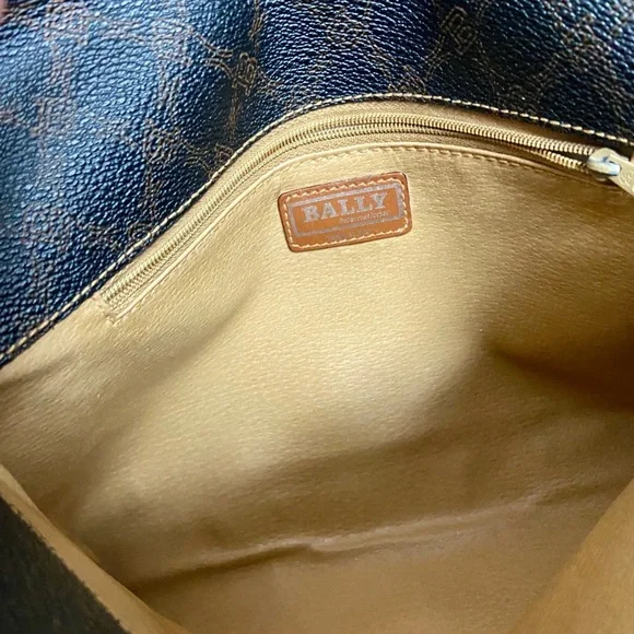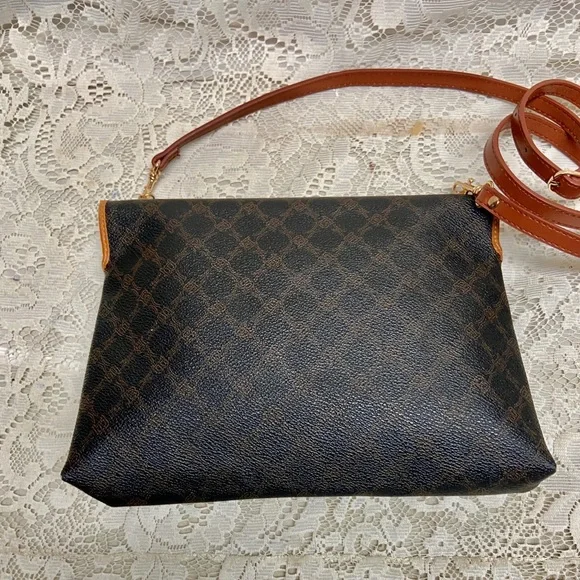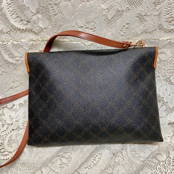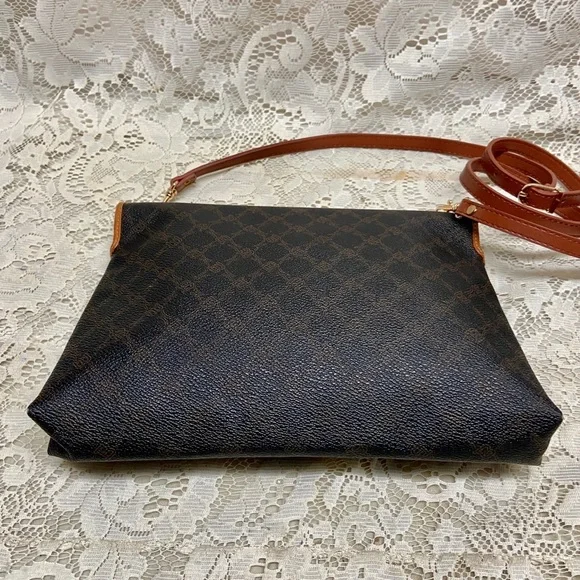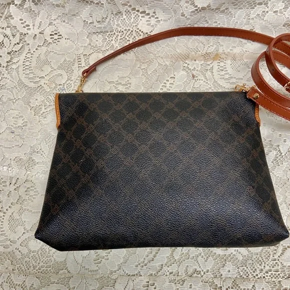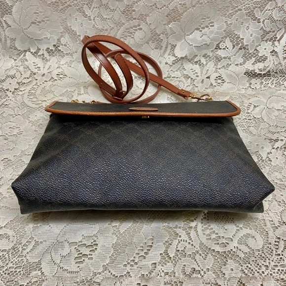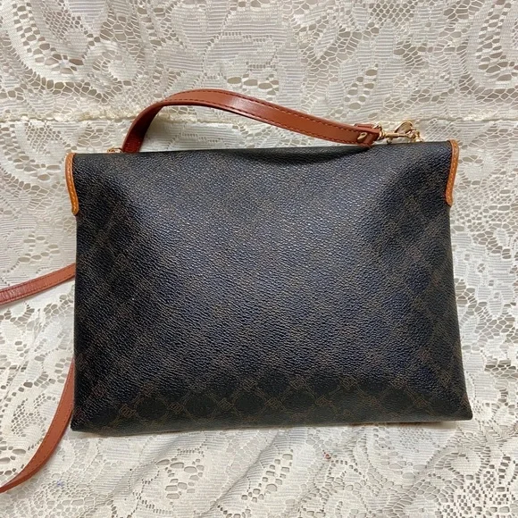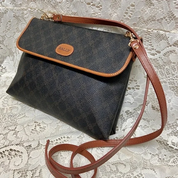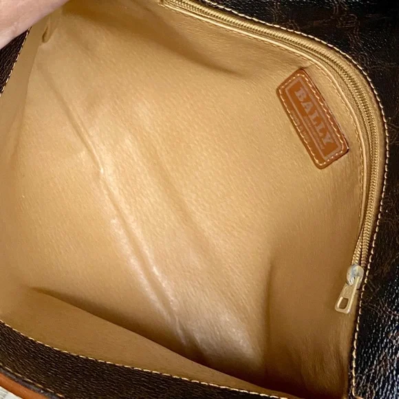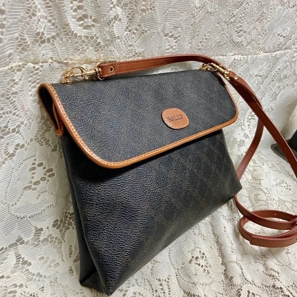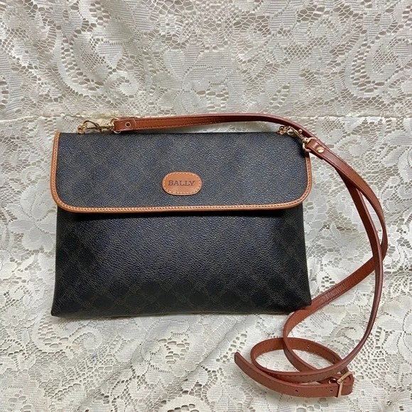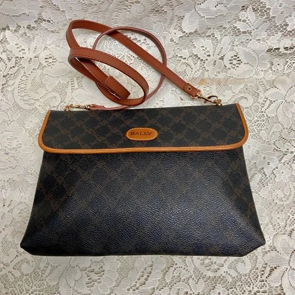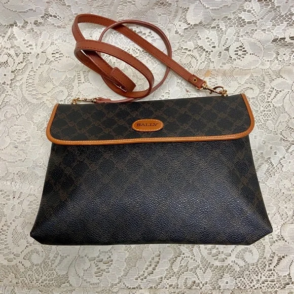 Bally Brown Coated Canvas-Leather Trim Clutch-Crossbody 11in x 8in x 2in. (TJ1022)This is a pre-owned multi function clutch handbag or crossbody, made of brown coated canvas with tan leather trim. This will be good enough for your, glasses, cell phone and wallet. It measures about 11inches long, 8 inches high and about 2 inches wide and comes with 50-inch adjustable shoulder-cross body strap. This was originally a clutch envelope converted into a crossbody or hooks and faux leather strap. The hook rivets and strap are removable if you want to use it as a clutch. Itis in good condition with minimal wear as shown in photos. It is marked: Bally Made in Italy.
